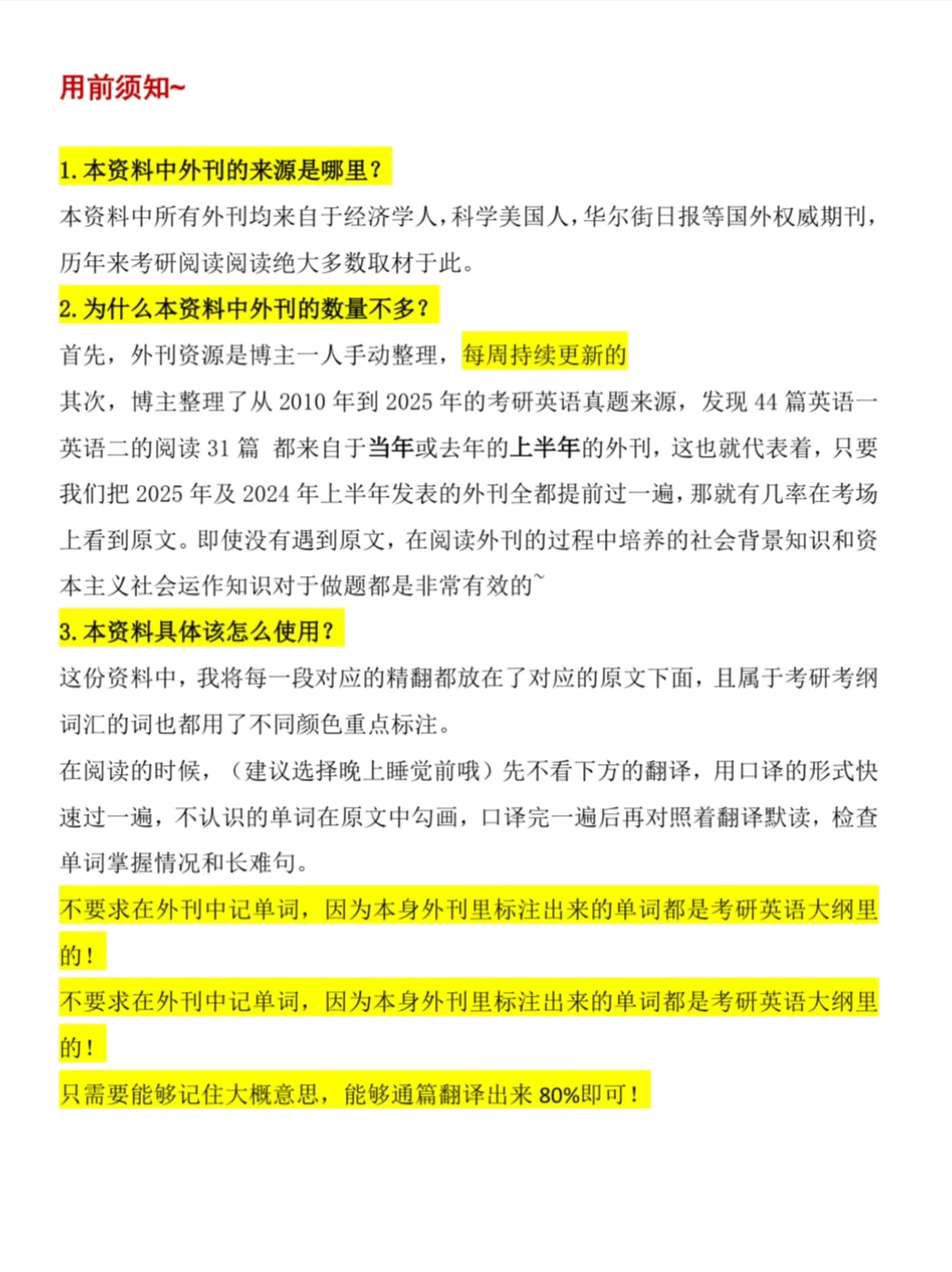 所以,我这份外刊首先的准入条件就是,每篇外刊都必须经过我的筛选,而我的筛选标准又是非常严格的,我要结合当下的出题趋势,当下的热点倾向,以及外刊的题材,争取能选出符合考研英语出题规则的外刊。
