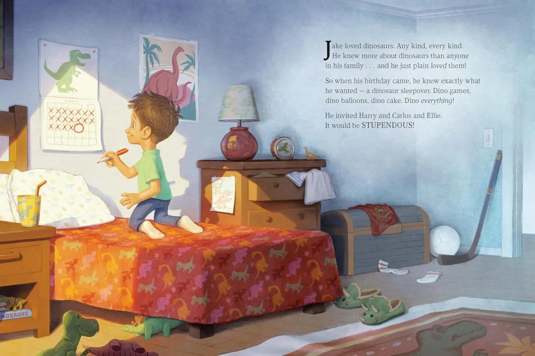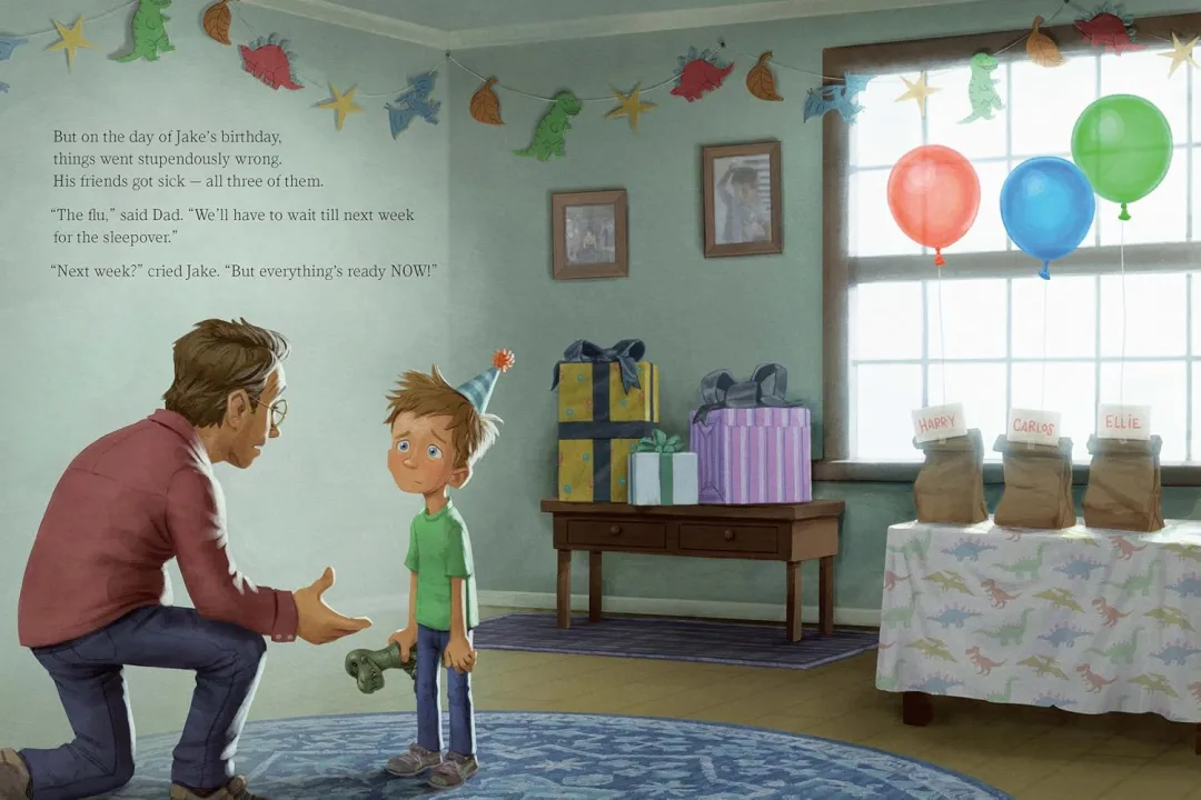 杰克喜欢恐龙,随着生日临近,他清楚地知道自己想要什么样的派对——一场恐龙主题的睡衣派对!有恐龙主题的游戏、恐龙形状的气球、恐龙造型的蛋糕。所有东西都是恐龙主题的!然而,当重要的生日当天到来时,他的朋友们都得了流感,这场派对似乎即将泡汤。