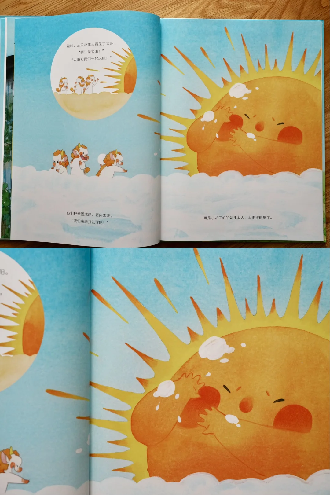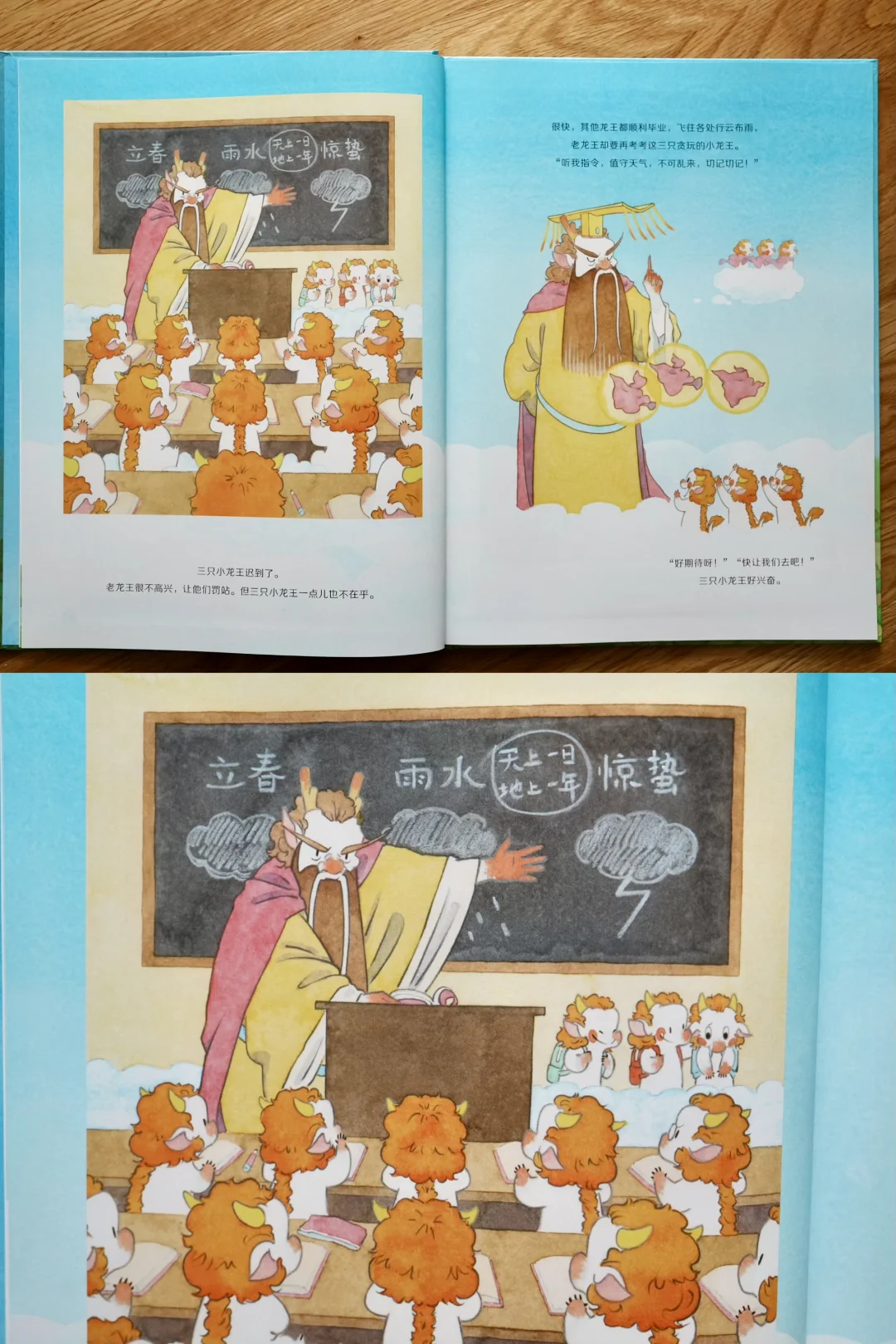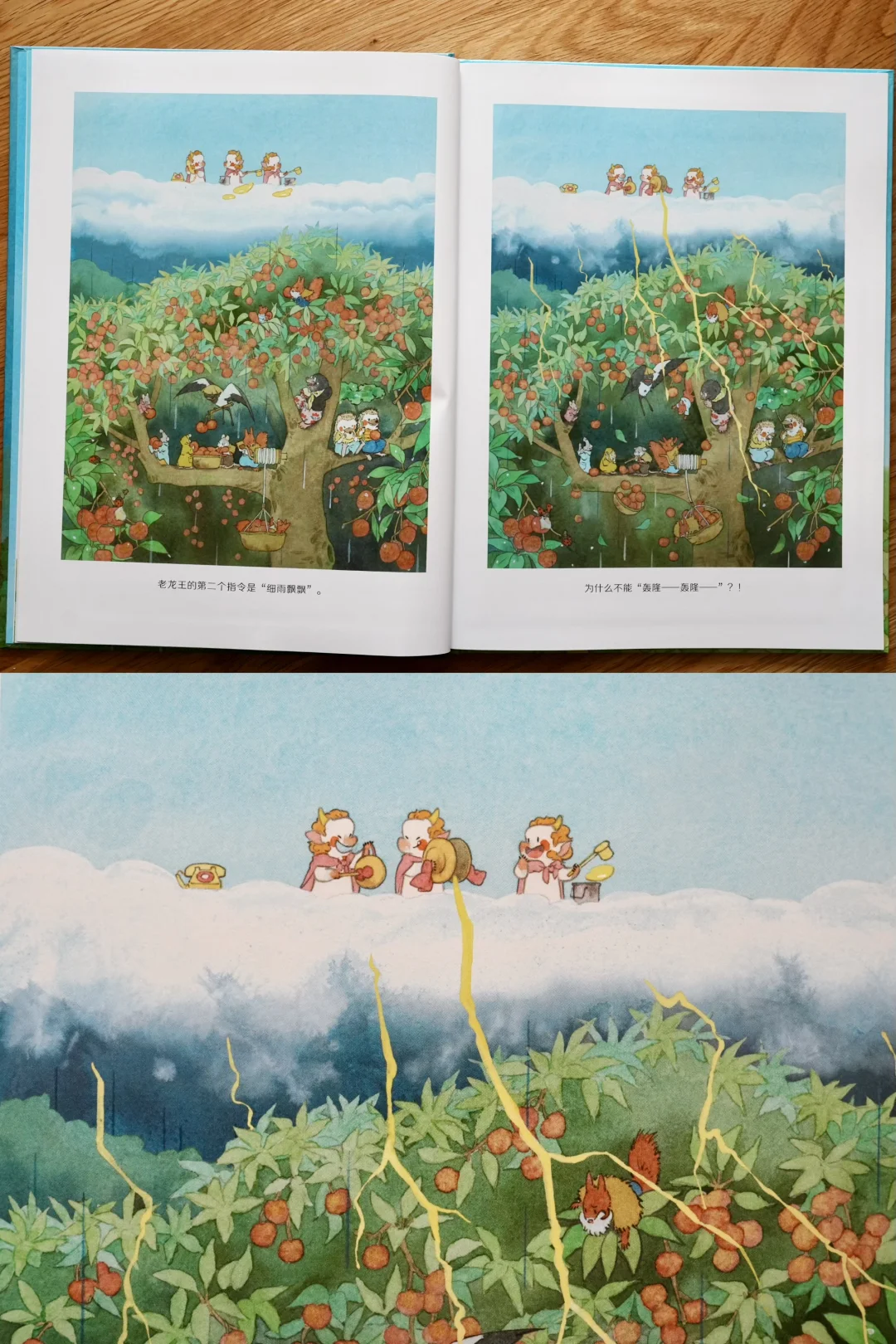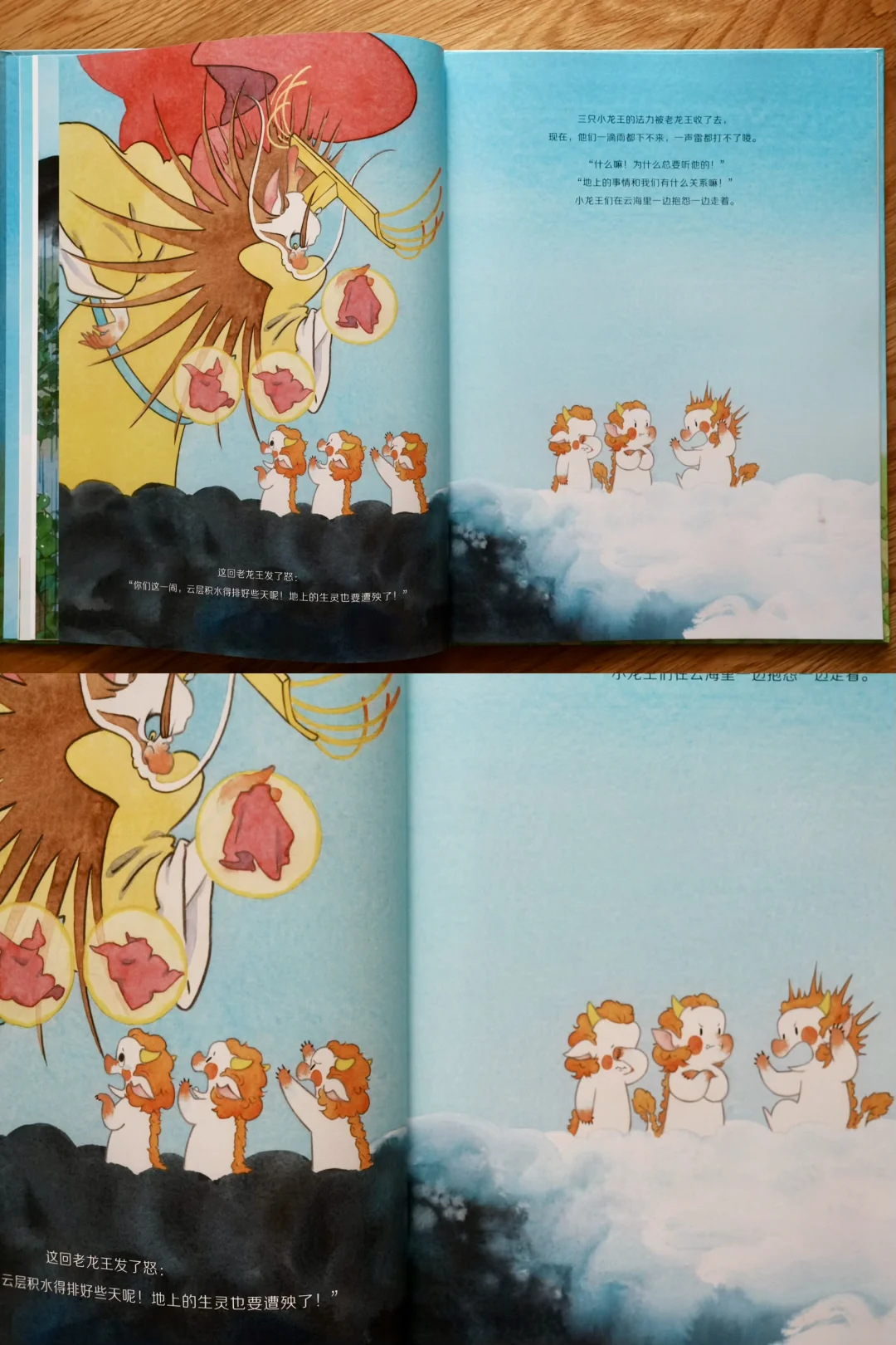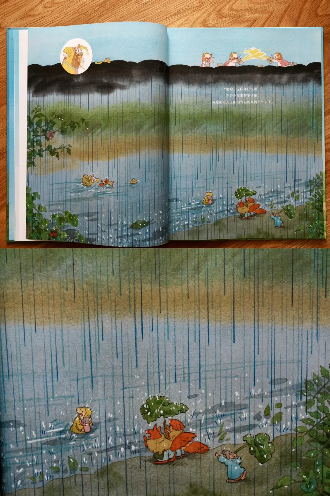 当小龙王们知道田鼠小姐马上要办婚礼,最大心愿就是有个好天气时,决定回天上帮忙。他们先找值班龙王求停雨,又去找老龙王和太阳,结果都被拒绝。