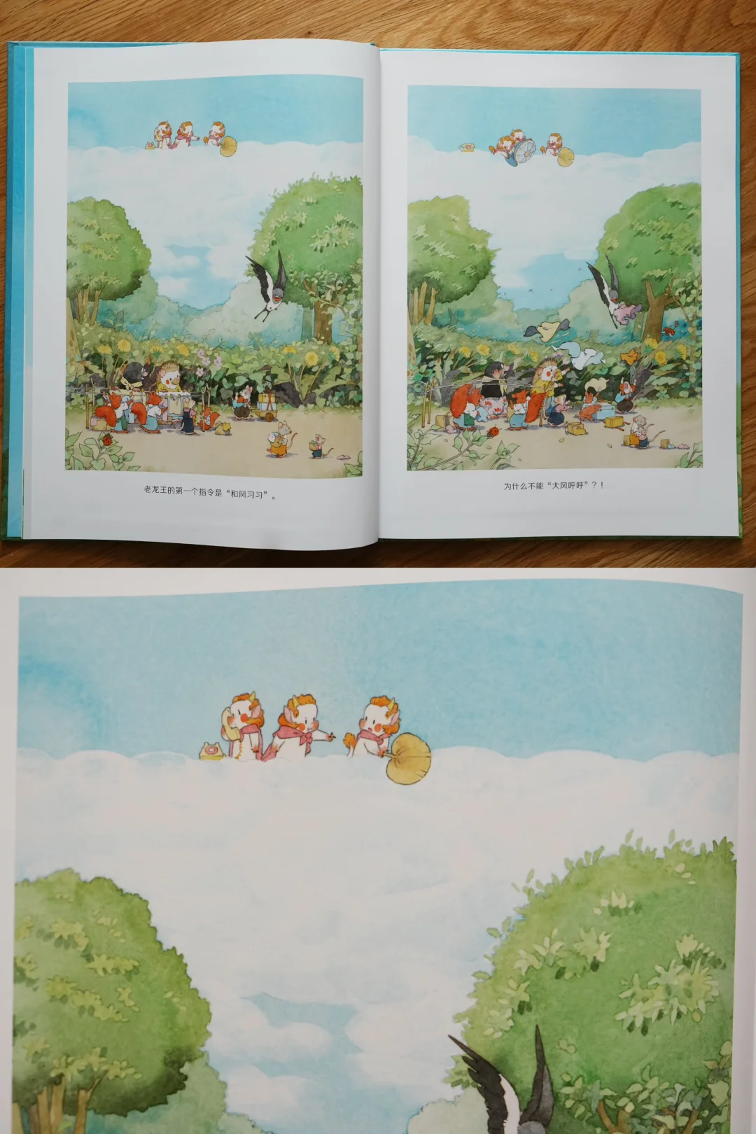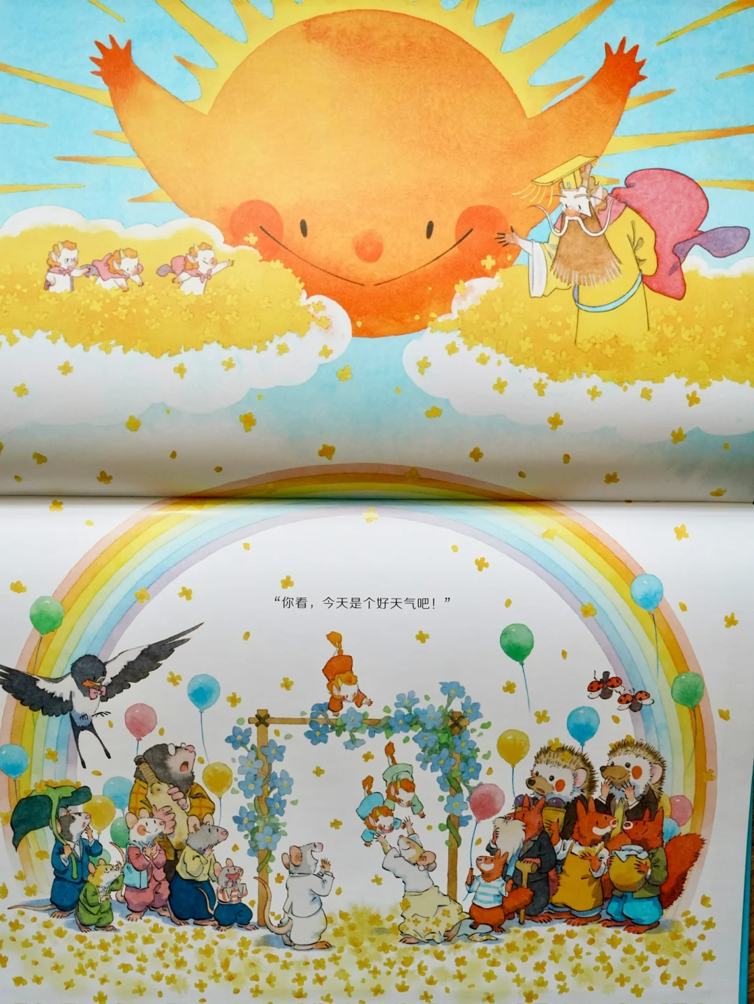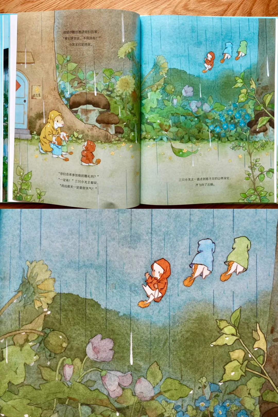 不过小龙王们没放弃,在山谷收集了好几天花瓣。婚礼当天,他们从云端洒下花瓣,来了一场浪漫的花瓣雨,给田鼠小姐带来好天气,也得到了老龙王和太阳的原谅。