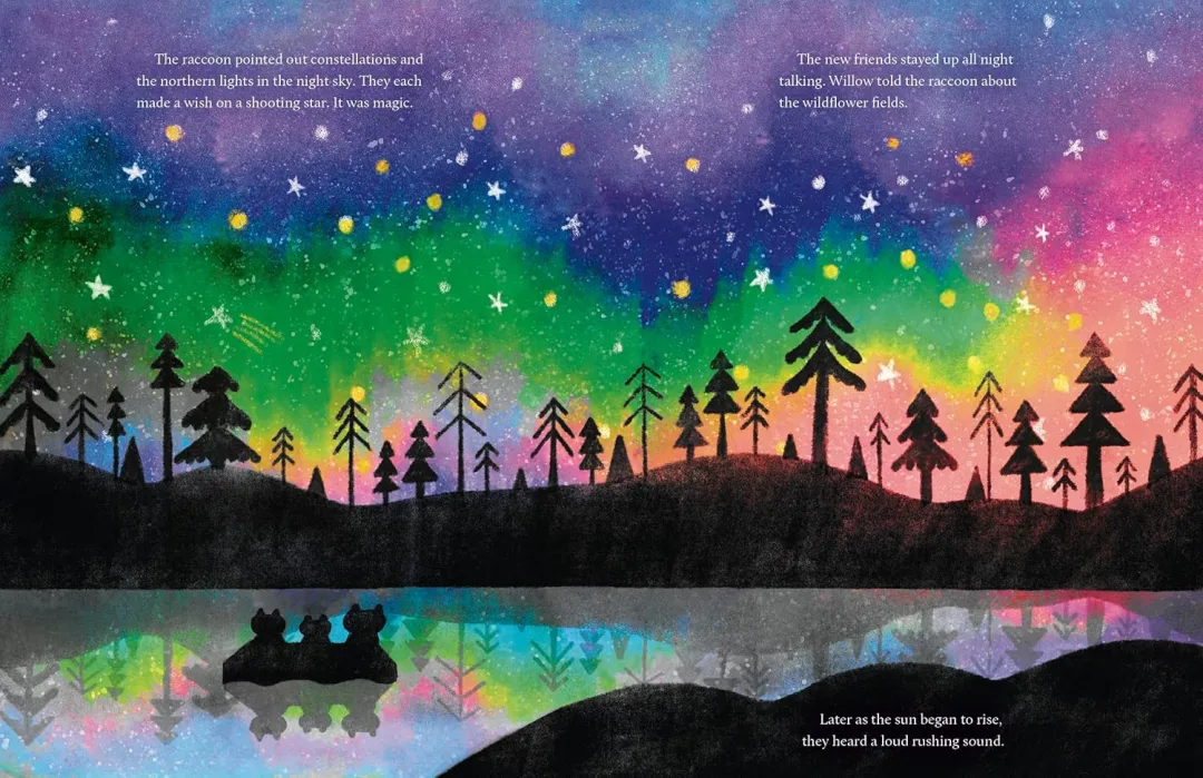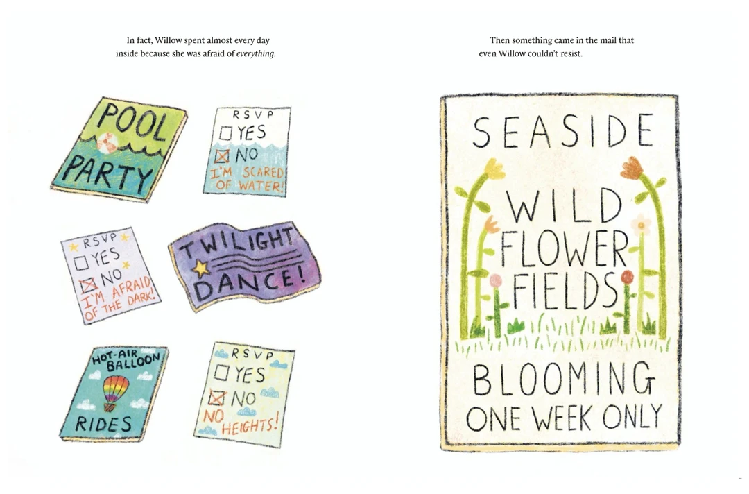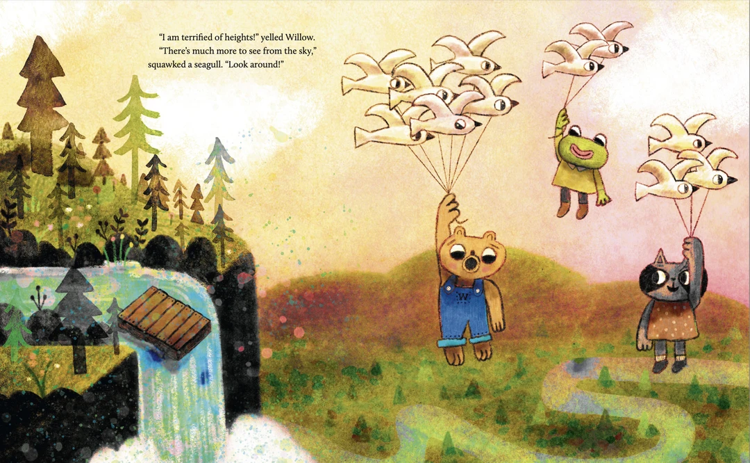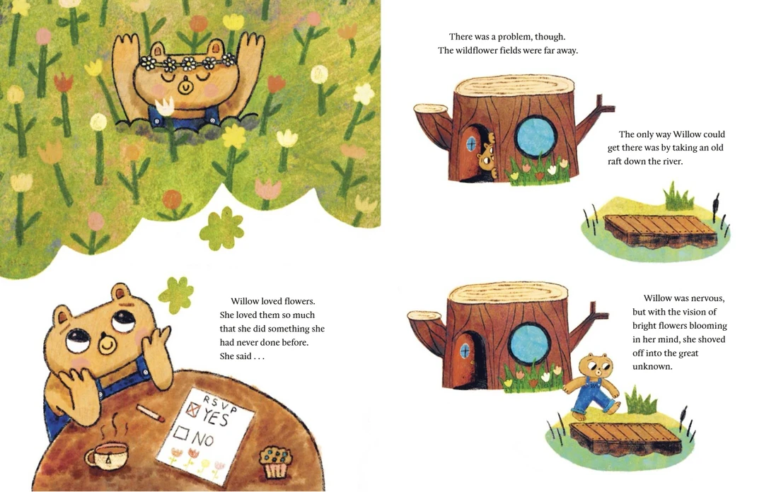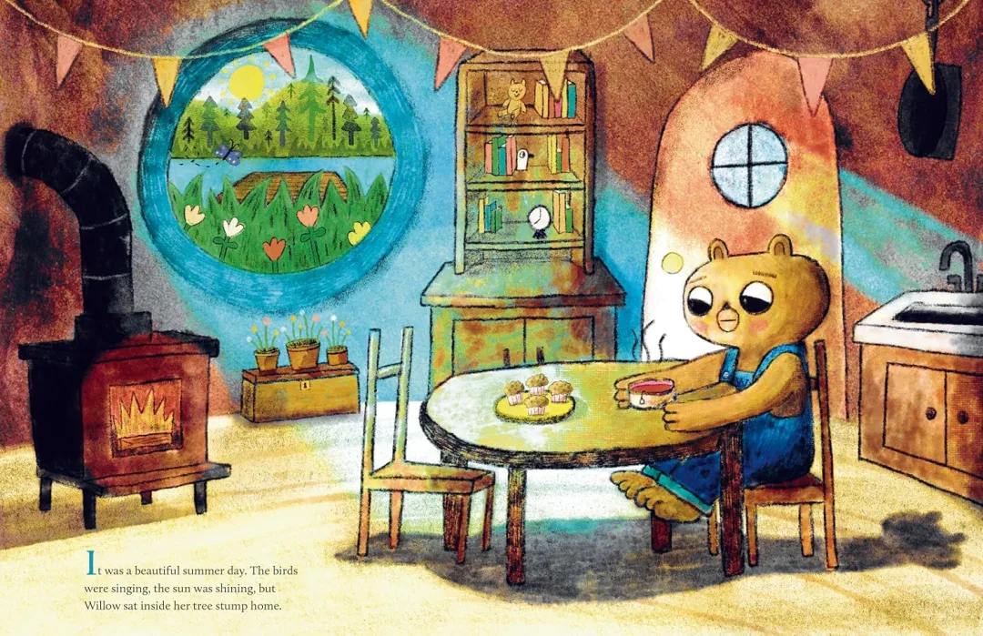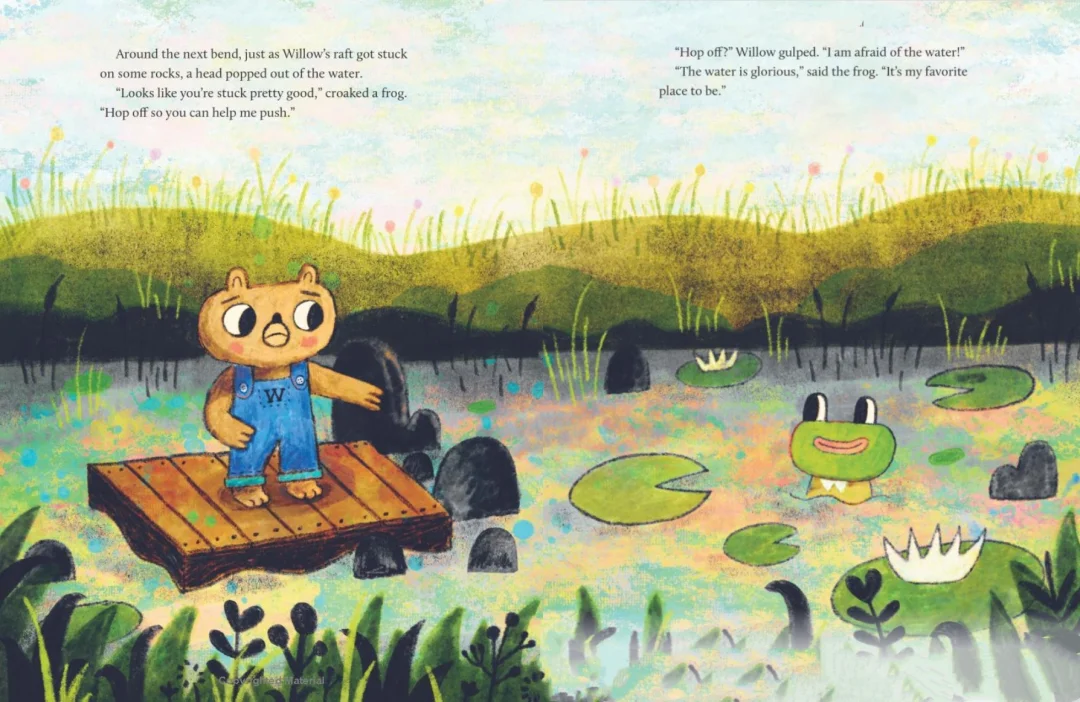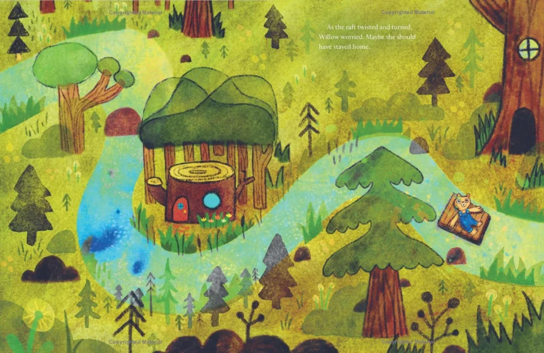 Willow 是一只对一切都充满恐惧的小熊,习惯躲在树桩家里,很少外出。当她收到 “海边野花节” 的邀请时,内心第一次萌生了 “想出去看看” 的念头。为了赴约,她必须踏上冒险之路:乘木筏顺流而下,穿过黑暗森林,躲避瀑布…… 途中虽遇到青蛙和浣熊的帮助,但恐惧仍让她犹豫是否该退缩。最终,Willow 能否克服恐惧,拥抱未知世界?故事以细腻的笔触展现了孩子面对挑战时的心理挣扎,以及勇敢尝试带来的惊喜。