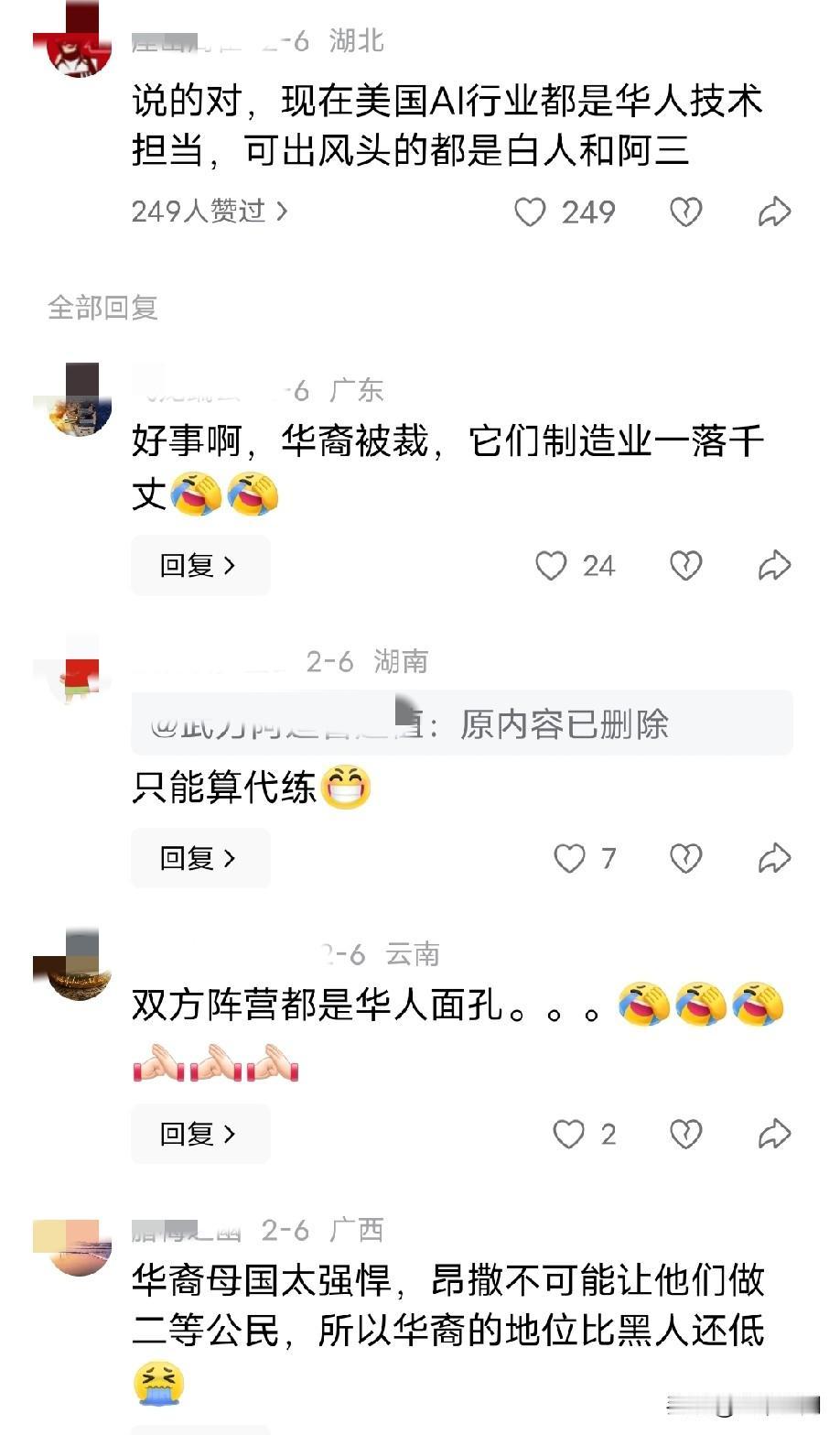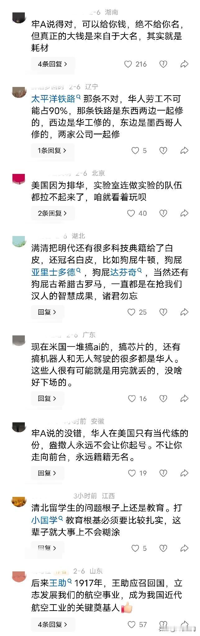 牢A说得太对了,美国那么多关键的军武科技都是华人主导做出来的,但是几乎没有一个华人能出人头地的,包括美国的芯片技术,里面的工程师几乎都是华裔,但是技术出来后,华裔都靠边站了,所以牢A用代练这个词真的准确得描绘出华人高科技人才在美国的尴尬处境,反而在哪个年代千辛万苦回来的留学生,最后都变成国内给个项目的领军人物,得到了人民的爱戴!所以这些出去的华人高科技人才,以前还有人羡慕它们,现在大家都可怜它们,估计很多都没有后代了!
