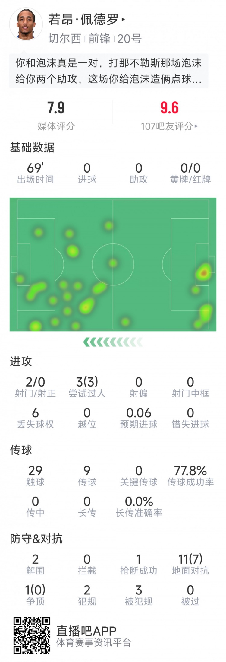 若昂·佩德罗本场数据:两次造点,2射0正,3次过人,7次成功对抗