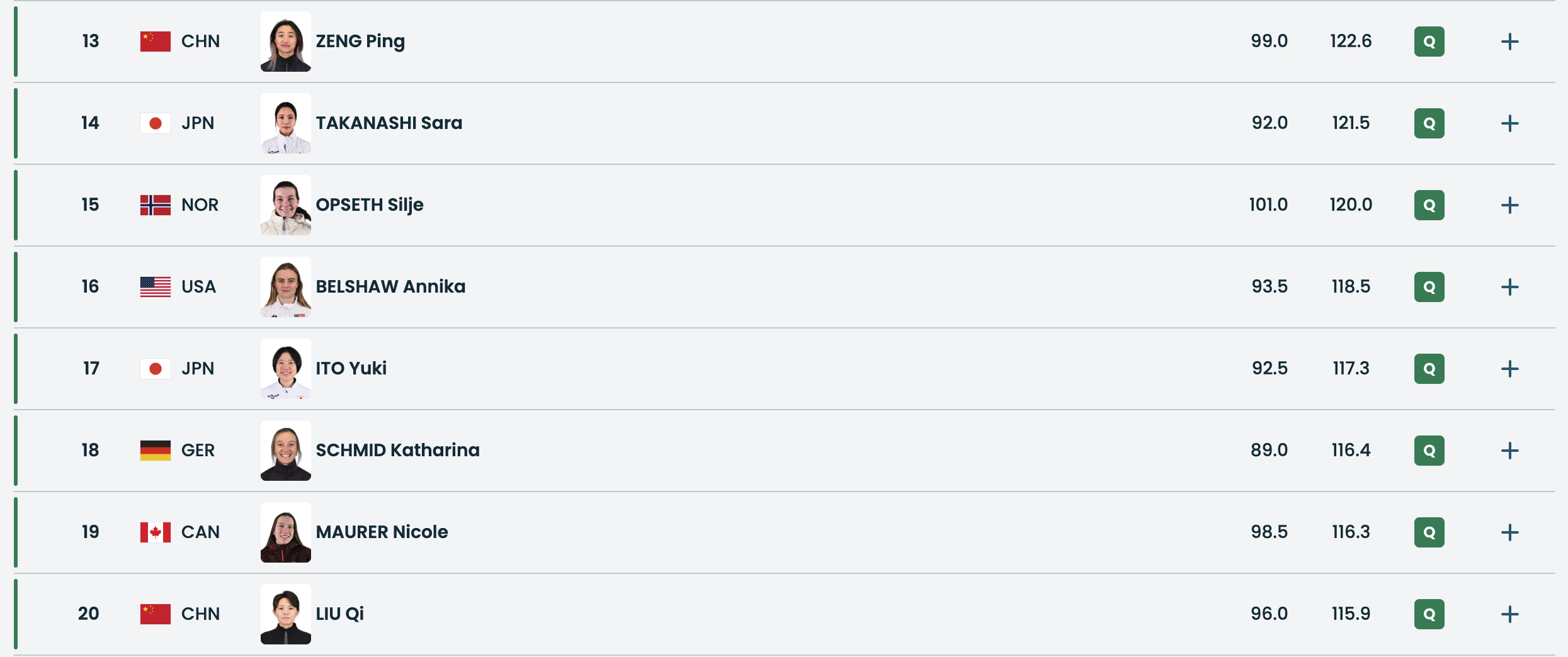 跳台滑雪女子标准台第一轮,🇨🇳来自四川的小将中国小将曾坪以排名第13的成绩成功晋级跳台滑雪决赛,🇨🇳来自吉林的29岁的老将刘奇以排名第20的成绩成功晋级跳台滑雪决赛,决赛将于稍后进行,为两位金花加油呐喊吧~