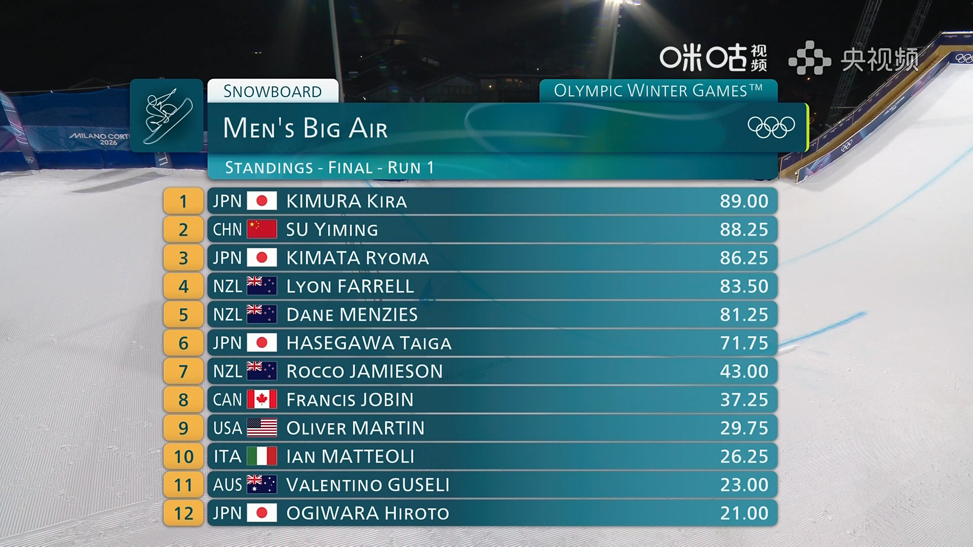 首轮暂列第二!米兰冬奥会单板滑雪男子大跳台决赛, 苏翊鸣凭借成功的1980得到88.25分,木村葵来89.00分暂列第一,木俣椋真86.25分排名第三。