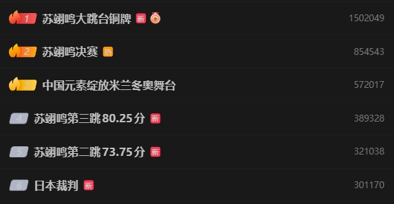 赛后微博热搜前九名均为冬奥会相关话题,其中七个与单板滑雪男子大跳台决赛有关。