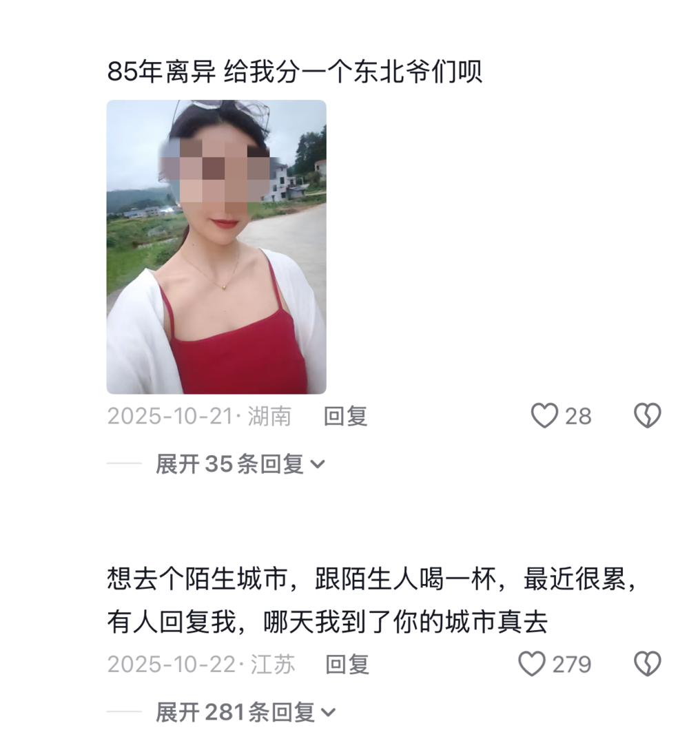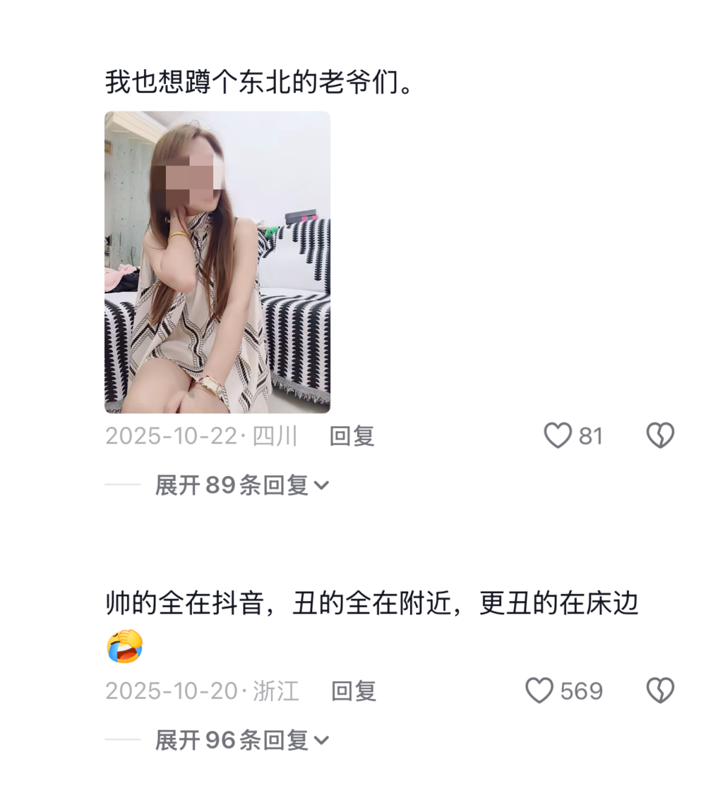 甚至还有贴上自拍照在评论区征集交友的。许多中年人不会划拉软件,但他们的胆子可比年轻人凶猛得多,总能让我想到抖音上的那位“白城大姨”。