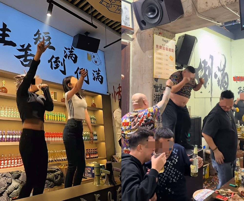 昏黄的灯光,包浆的劣质木桌,十块钱的塑料凳子。室内大屏幕上循环播放着抖音神曲,每张桌子甚至还配备一个扩音喇叭,酒馆希望客人跟着屏幕上的字幕一起大合唱,类似于一个兼具酒馆功能的公共老式卡拉OK。