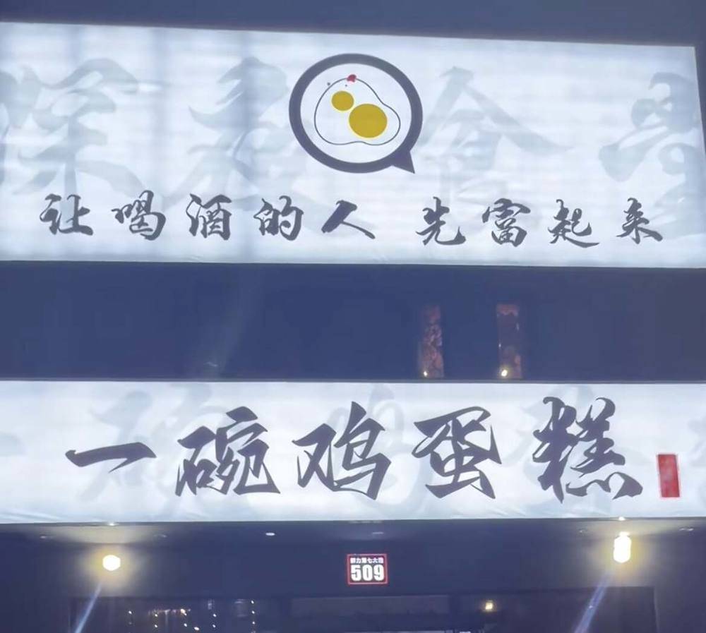 酒馆里面挂满了用江湖体写下的土味标语,类似于“让喝酒的人先富起来”“宁可扶墙吐,也不抱人哭”“人生苦短,把酒倒满”“祝您牛逼”。
