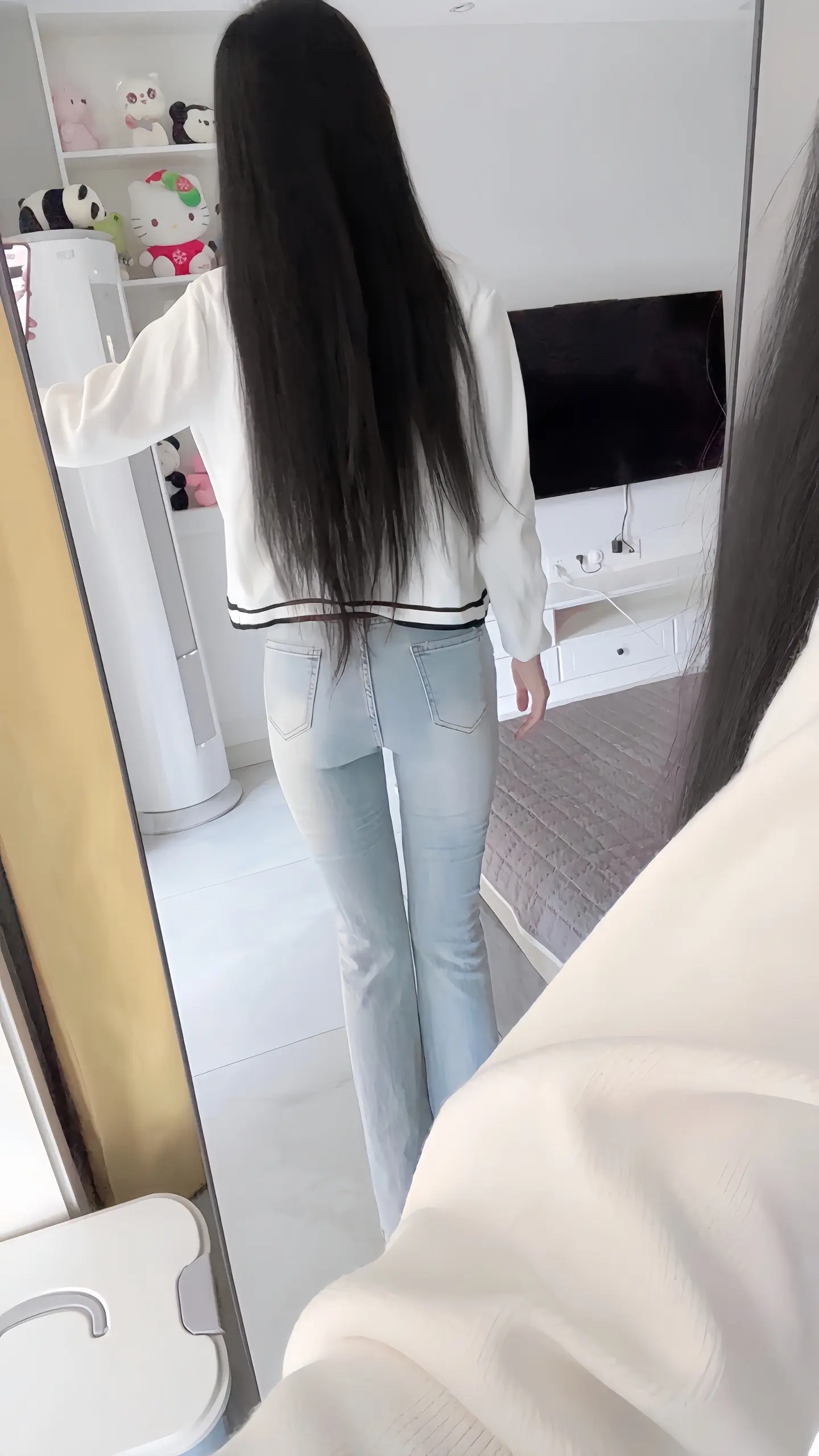 对镜拍紧身牛仔裤清纯完美身材背影杀