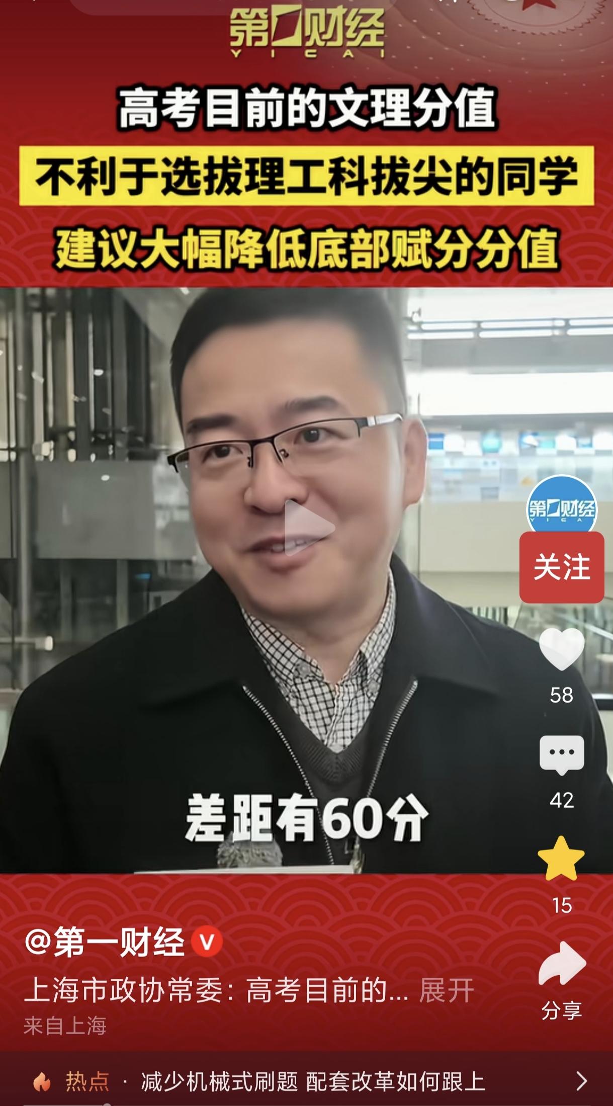 高考理科分值权重较低难以选出拔尖的理工科人才?上海市政协常委、985高校华东师大招生办主任周立旻在2026年上海两会期间提出了高考改革建议。 在他看来,理科拔尖人才选拔难。目前上海高考的“3+3”模式中,理科科目的分值权重过低,导致数理能力极强但语文、外语稍弱的学生(即“偏科”的理科天才)在总分上吃亏,难以被顶尖高校录取。 具体问题首先就是赋分制“削峰”,导致区分度不足:选考科目(小三门)满分70分,但起评分是40分,实际有效分差只有30分,三科加起来才90分。这导致顶尖学生和普通学生的差距被压缩,出现了“削峰效应”。 其次是权重失衡:语数外三门主科占450分,而理科三门加起来才210分。学生为了拿高分,不得不把大量精力花在文科上,理科投入的回报率太低。 他提出了改革建议:降低保底分,要大幅降低底部赋分分值,将起评分从40分下调至10分,这样能拉大分差,让理科特长生在总分中真正“冒尖”。 不仅上海,其他地方的家长也有这种呼声。有家长建议这么着: 语文100分,只考作文。英语80分只考阅读和写作,物理120分,数学150分,化学100分,生物80分,你们觉得怎么样?