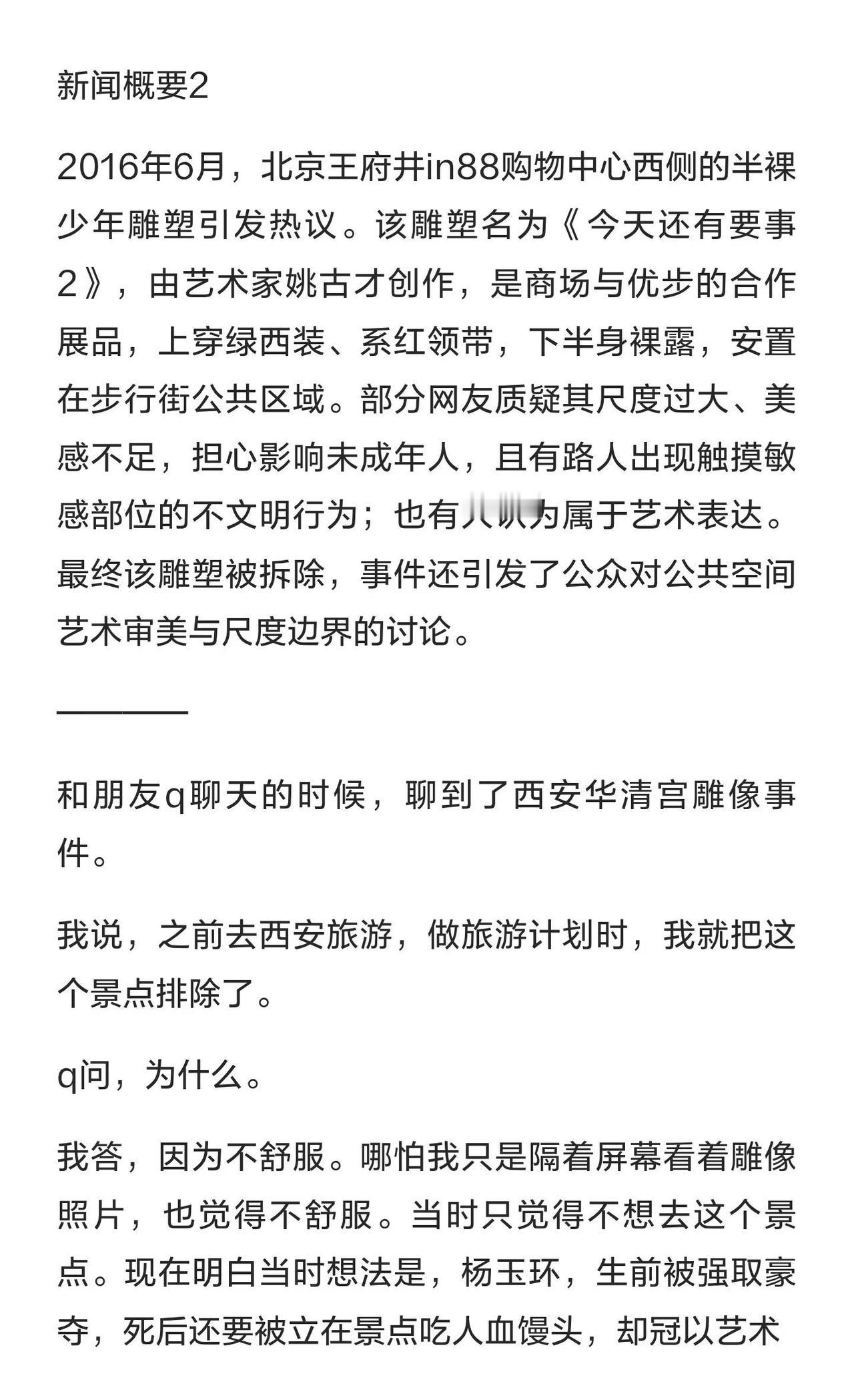 不要沉默 西安华清宫“贵妃出浴”雕像因网友指责“不雅观”引发热议,景区称设计方案合规,已报备等待,无处理。北京王府井半裸少年雕塑因尺度问题被拆除,引发对公共艺术审美的讨论。两事件均涉及对历史人物的不当展示与公众不适感。 生活 思考