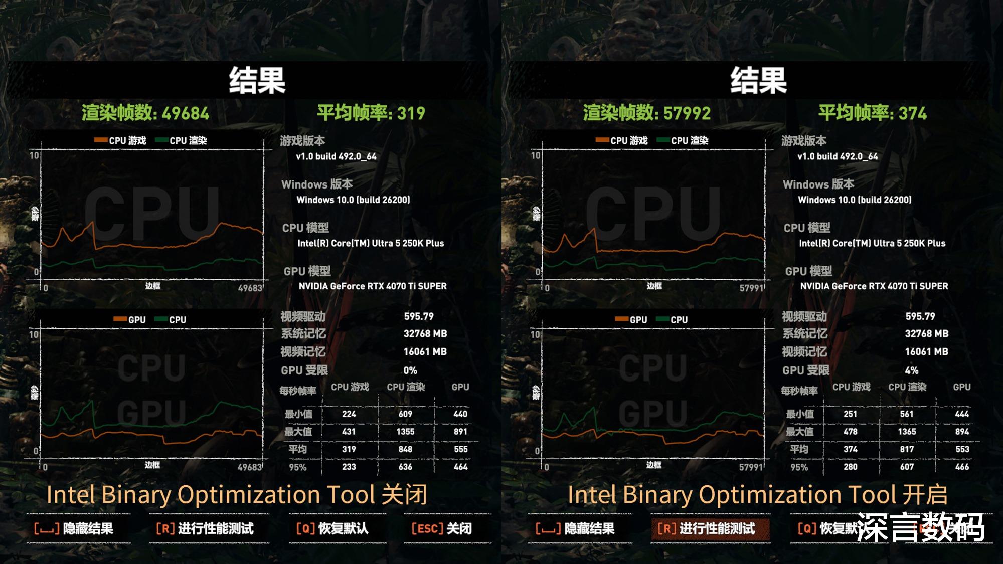 测试开启英特尔二进制优化技术前后的游戏表现,将《古墓丽影:暗影》游戏画面分辨率设为1080P,在预设最低画质设定之下游戏平均帧率为319FPS,当开启英特尔二进制优化技术后,此时游戏平均帧率为374FPS,平均帧率提升了约17.2%,该技术所带来帧率提升相当可观。