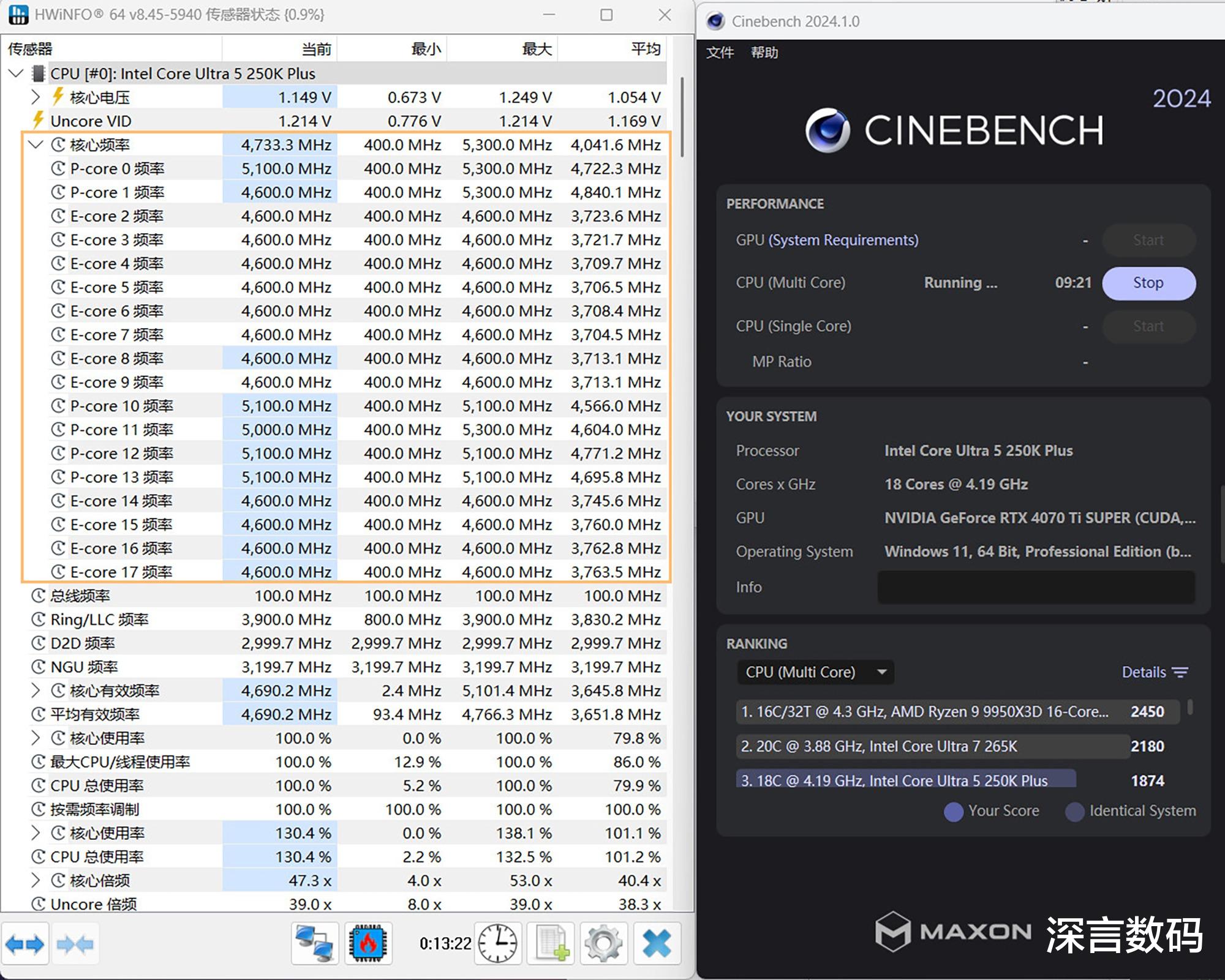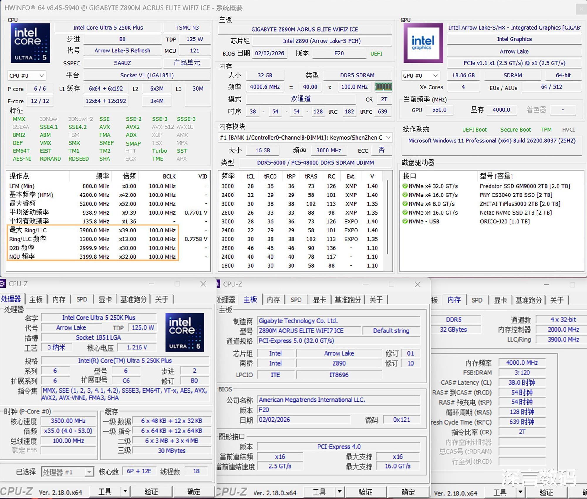 首先利用CPU-Z与HWiNFO软件了解处理器当前运行状态,前代英特尔酷睿Ultra5 245K处理器的D2D、NGU与Ring频率较为保守,分别为2.1GHz、2.6GHz与3.8GHz,英特尔酷睿Ultra5 250K Plus处理器的D2D、NGU与Ring频率分别提高至3.0GHz、3.2GHz与3.9GHz。