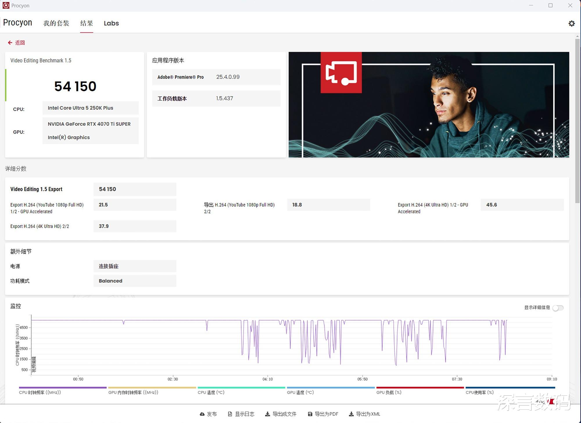 视频编辑测试项目中的得分为54545,由于新版本主要依靠独立显卡进行视频编解码,显卡性能直接影响最终结果,因此成绩仅供参考。