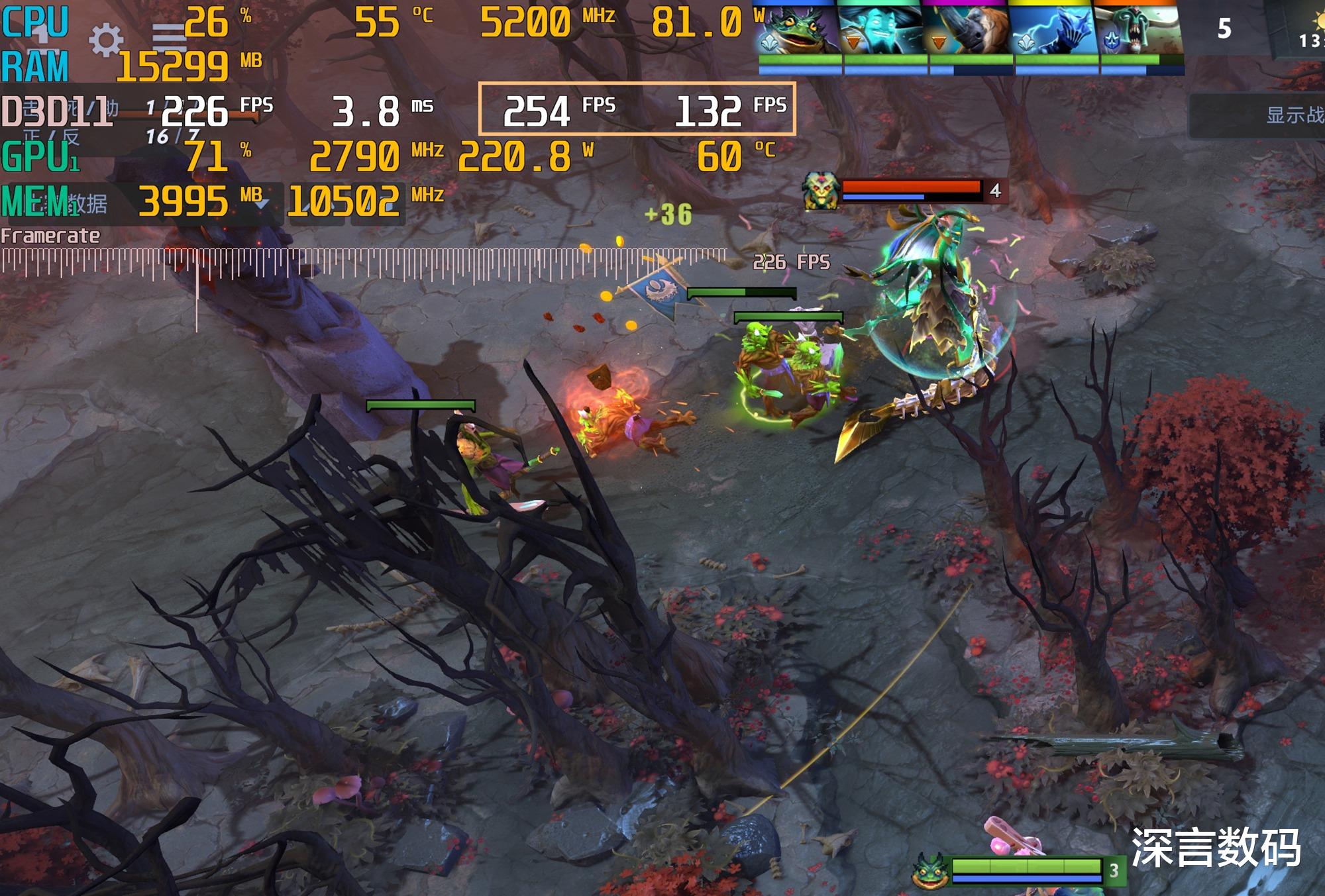 将《DOTA2》游戏画面分辨率设为4K,并将画质设为预设最高画质档位,观战十分钟实测平均帧率为254FPS,1%Low帧率为132FPS,《DOTA2》游戏对处理器的单核性能有近乎苛刻的要求,即便在4K分辨率与最高画质设定之下,显卡负载基本处于70%~90%。