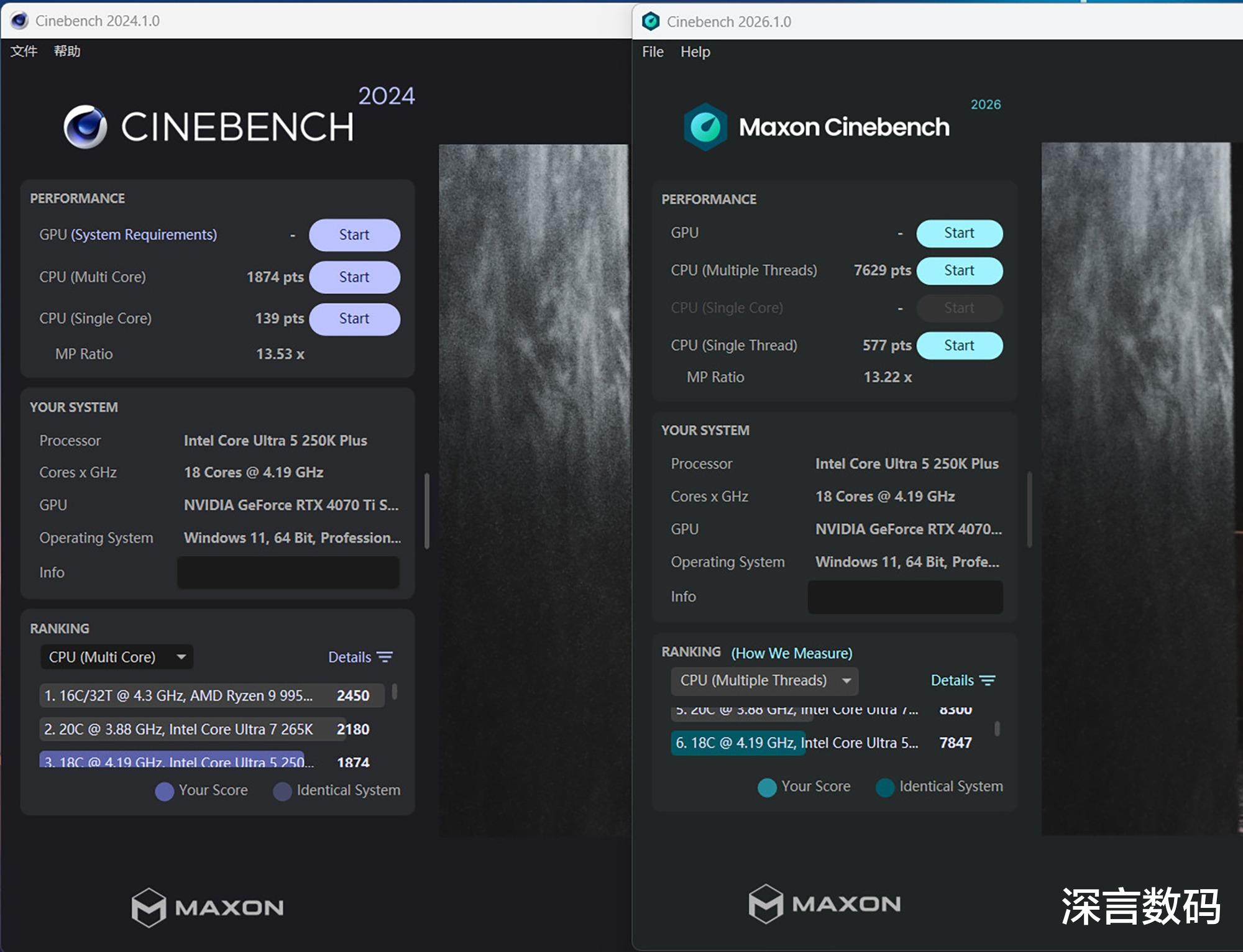 英特尔酷睿Ultra5 250K Plus处理器在CineBench 2024基准测试软件中的多核得分为1874,单核得分为139,在CineBench 2026基准测试软件中的多线程得分为7629,单线程得分为577,软件增加了超线程/SMT测试项目,由于Ultra5 250K Plus处理器不支持超线程因此没法测试单核成绩。