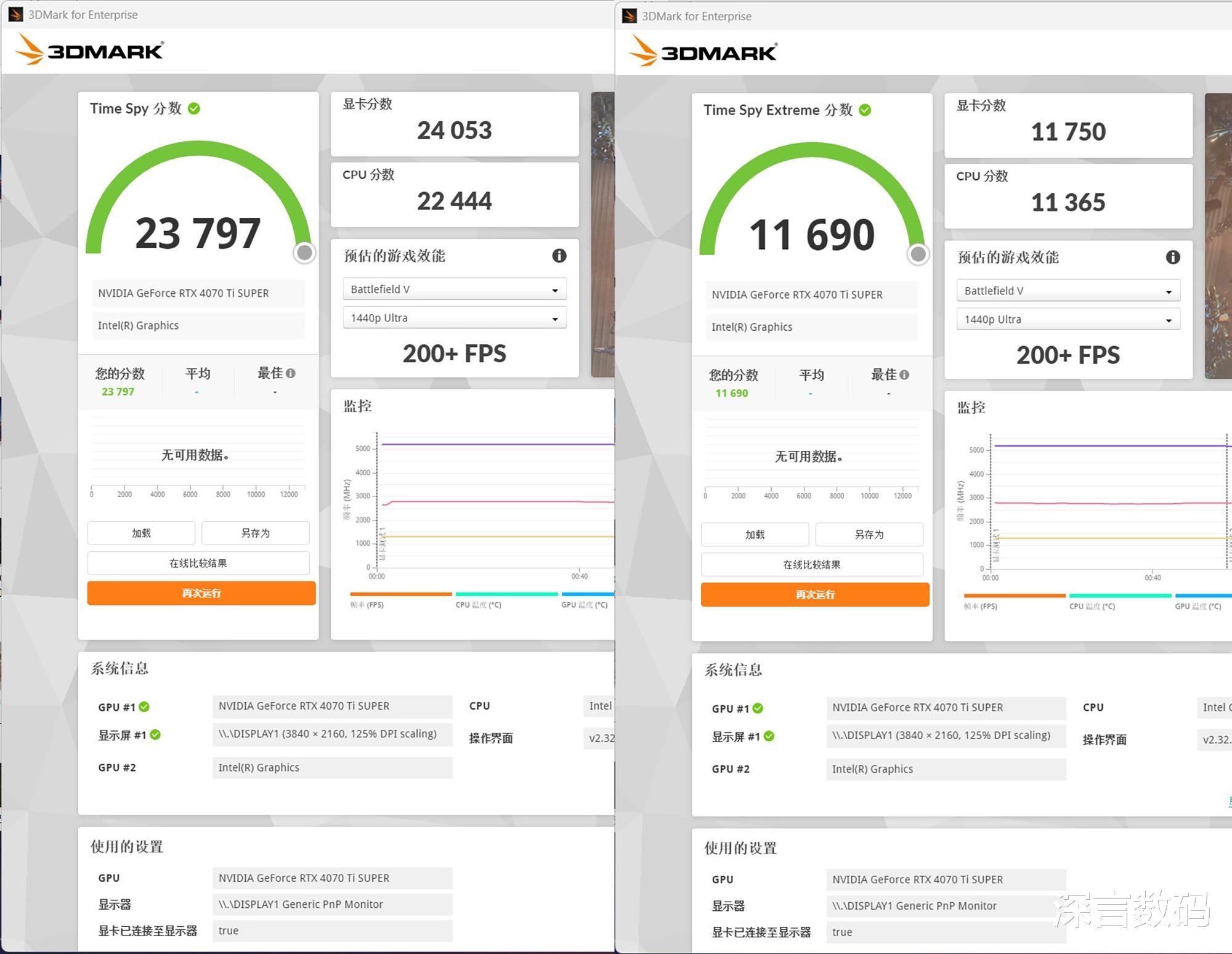 3DMark基准测试软件部分,2K分辨率的Time Spy项目中的综合得分为23797分,其中图形得分为24053,CPU得分为22444,而4K分辨率的Time Spy Extreme项目的综合得分为11690,其中图形得分为11750分,CPU得分为11365分。