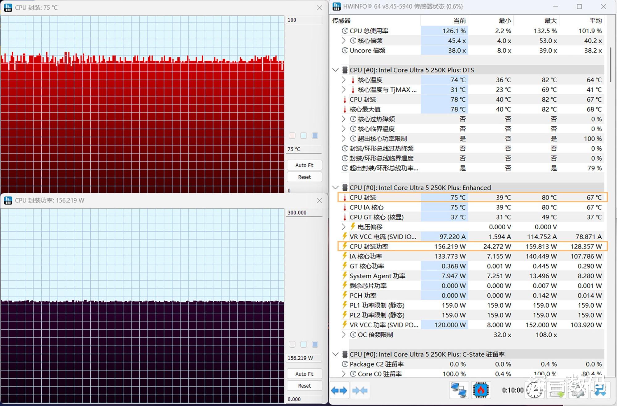 酷睿Ultra5 250K Plus处理器比酷睿Ultra5 245K处理器增加了4个能效核心,频率也有所提升,不过功耗墙指标两者完全相同,159W的功耗墙并不算特别高,接下来对英特尔酷睿Ultra5 250K Plus处理器进行烤机压力测试,单烤FPU项目时软件显示处理器当前封装满载功耗为159W,封装温度约为78°,此时水冷散热器转速还没拉满,一般情况下搭配双塔风冷散热器就完全足够。
