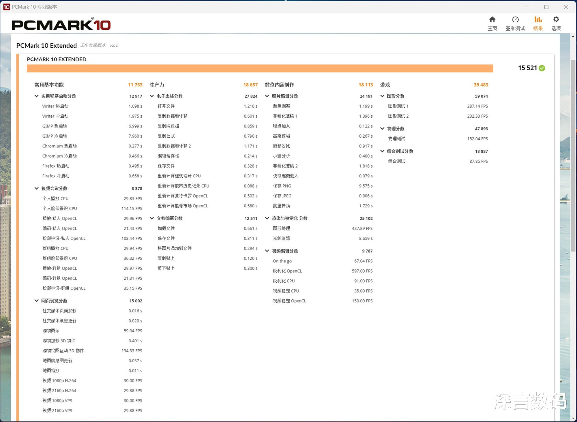 PCMark 10 Extended测试项目,涵盖从日常生产力任务到实时渲染测试,综合得分为15521,其中常用基本功能得分为11753,生产力得分为18657,数位内容创作得分为18113。
