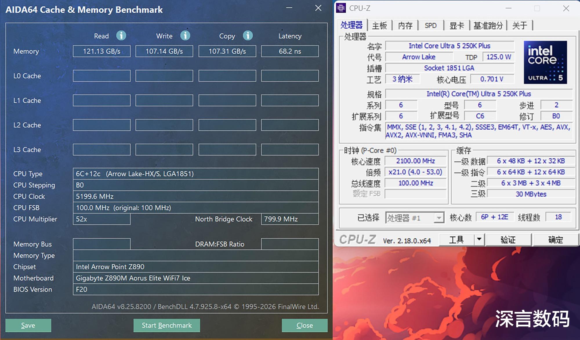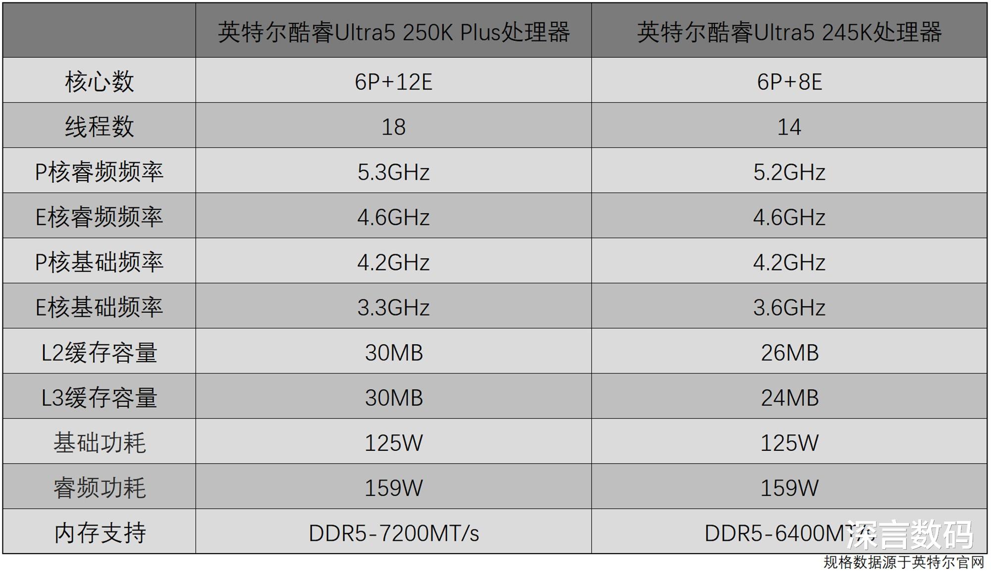 英特尔酷睿Ultra5 250K Plus处理器的架构与工艺依然没变,计算核心仍是台积电N3B 3纳米制程工艺,参数规格方面,六个性能核心,十二个能效核心,共18核心18线程,二级缓存容量为30MB,三级缓存容量为30MB,最大睿频频率为5.3GHz,最大睿频功耗为159W,相比前代Ultra5 245K处理器,增加了四个能效核心与四线程,二级缓存容量增加了4MB,三级缓存容量增加了6MB。