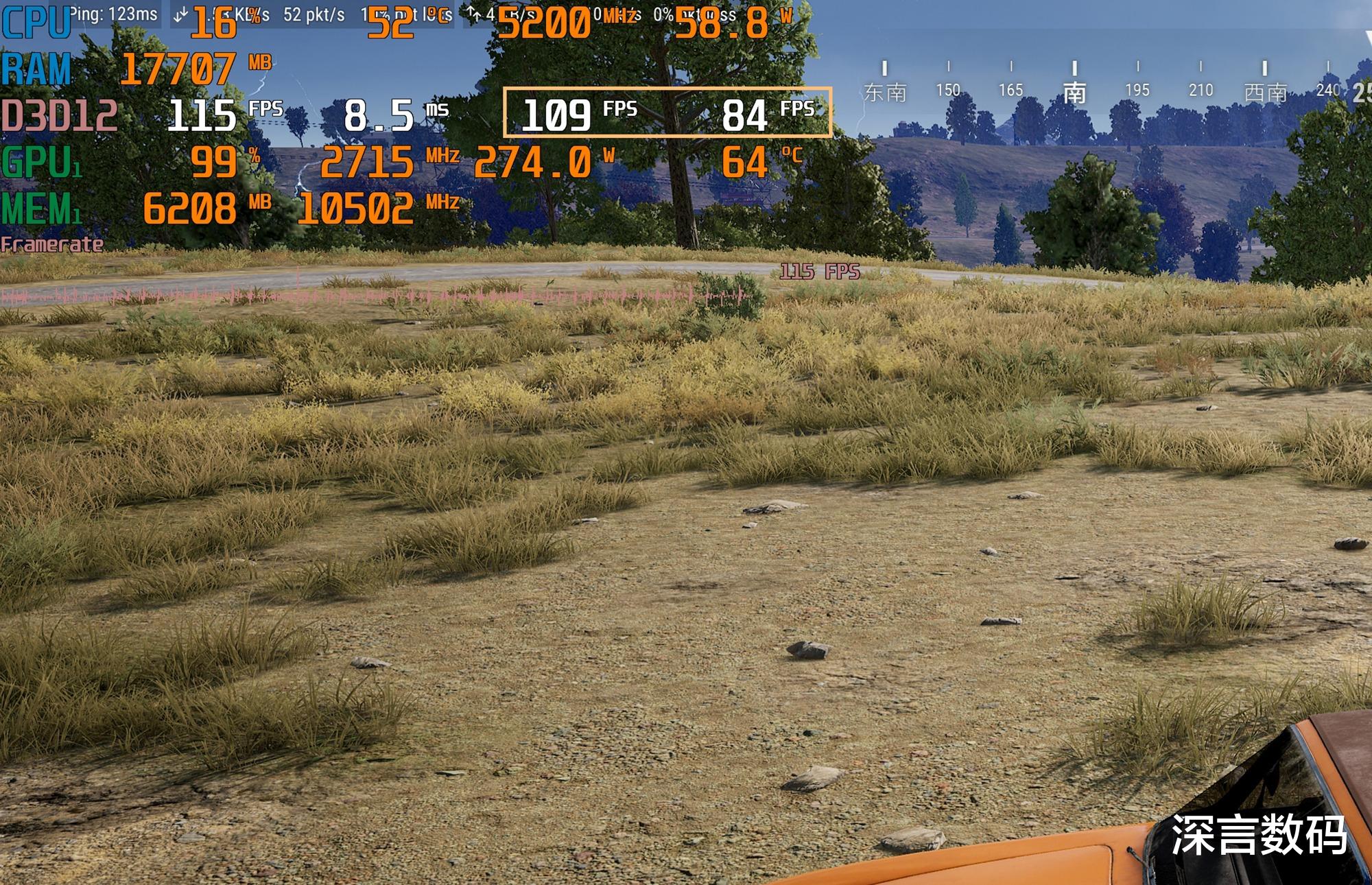 将《PUBG》游戏画面分辨率设为4K,并将画质设为预设超高画质档位,全部参数保持默认无修改,DirectX版本设置为DX12,地图为艾伦格单排赛,在游戏地图中驾车行驶,平均帧率为109FPS,1%Low帧率为84FPS。