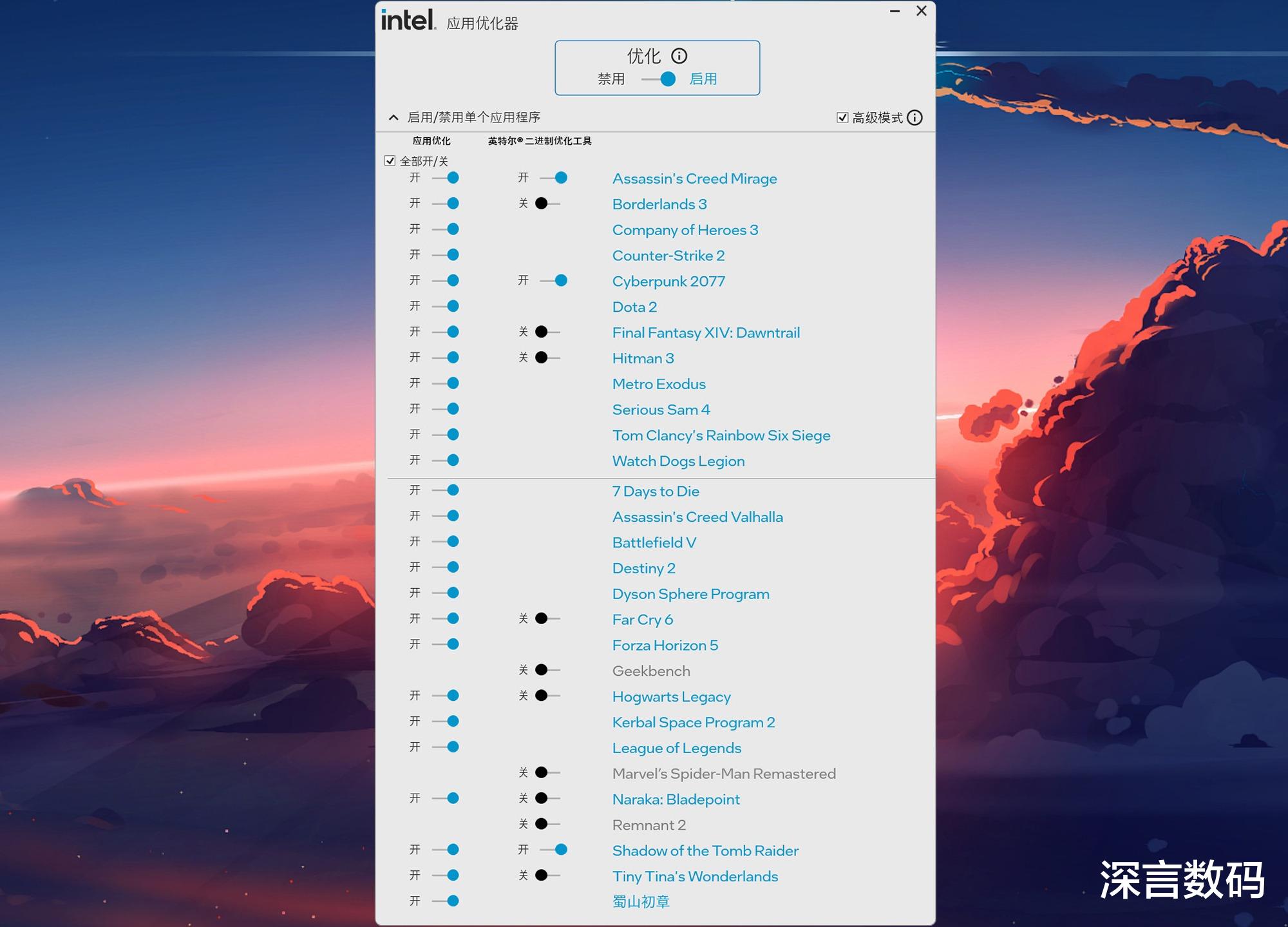 英特尔二进制优化技术(Intel Binary Optimization Tool)属于APO套件的一部分,英特尔二进制优化技术目前支持12款游戏,软件界面里勾选高级模式后可查看支持的游戏列表,包括《刺客信条:幻景》、《赛博朋克2077》等热门游戏大作,英特尔宣传二进制优化技术可实现平均8%的帧率提升,部分游戏更能达到22%的帧率提升,英特尔提供英特尔平台性能套件安装程序 (IPPP),一键安装APO与IBOT所需的套件,对于小白用户省去了查找安装的繁琐步骤。