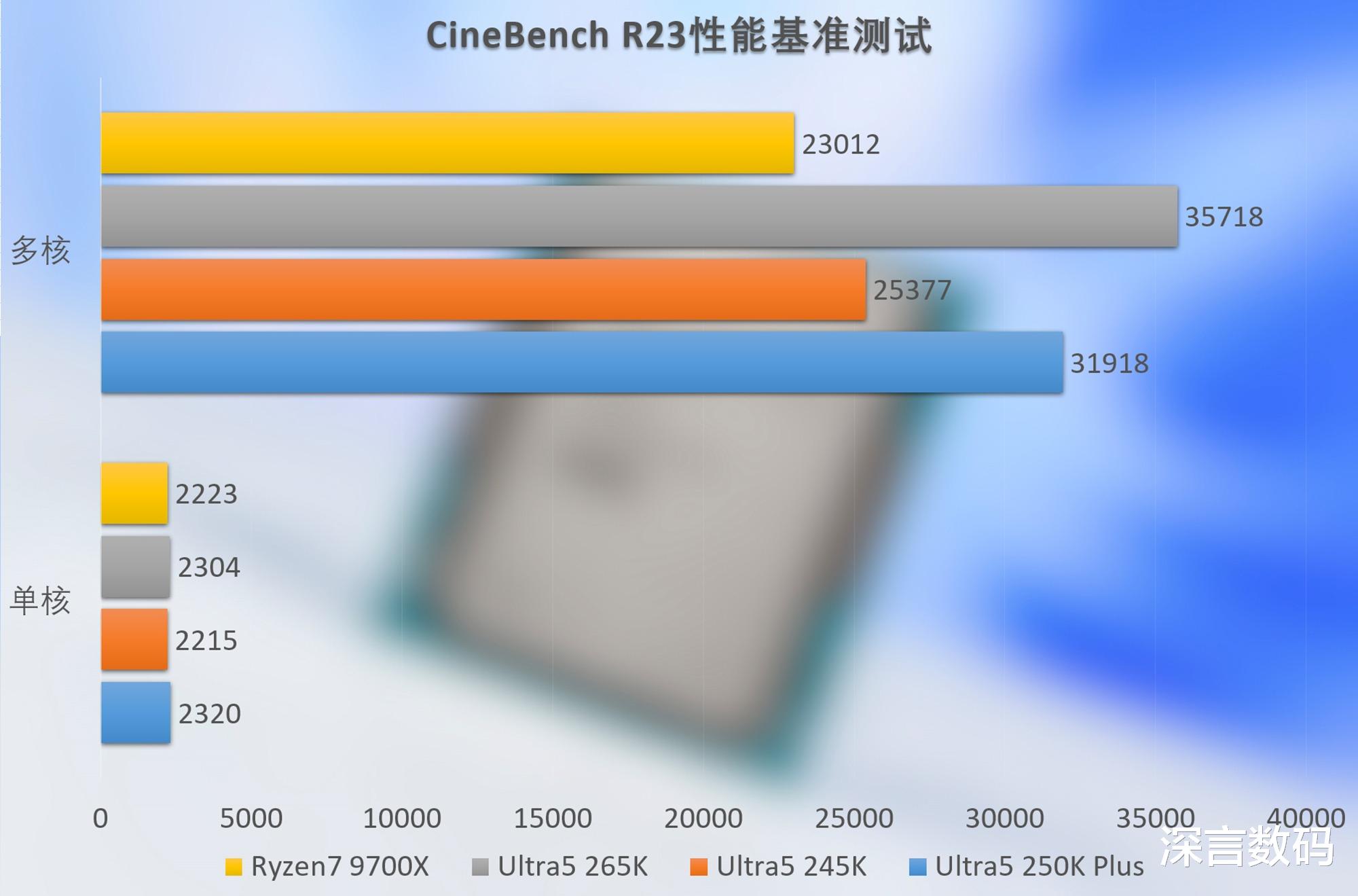 以CineBench R23得分为例,英特尔酷睿Ultra5 250K Plus处理器相较于英特尔酷睿Ultra5 245K处理器,多线程得分提升了超过25%,相较于Ryzen7 9700X处理器多核性能领先38.7%,与英特尔酷睿Ultra7 265K处理器相比性能差距约为12%,若Ultra5 250K Plus解锁功耗墙后性能差距还会被缩小。