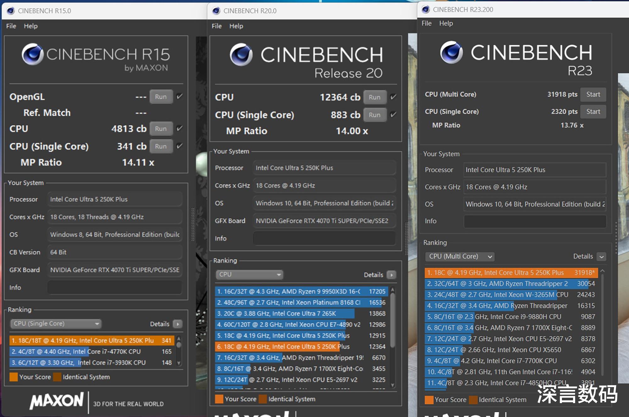 英特尔酷睿Ultra5 250K Plus处理器在CineBench R15基准测试软件中的多核得分为4813,单核得分为341,在CineBench R20基准测试软件中的多核得分为12364,单核得分为883,而在CineBench R23基准测试软件中的多核得分为31918,单核得分为2320分。