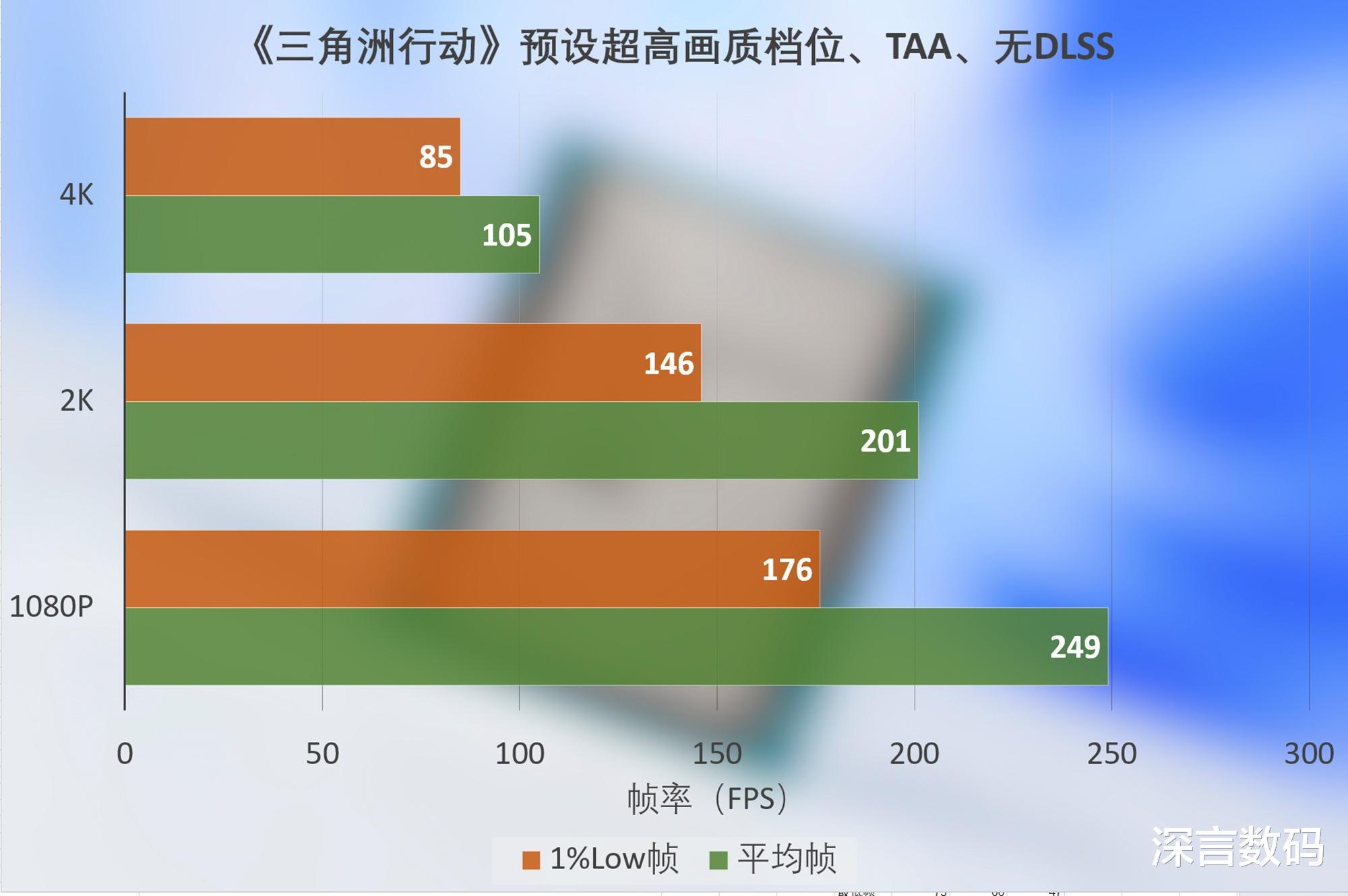 《三角洲行动》同时测试三种不同分辨率的帧率表现,画质设定均为预设超高档位,并开启TAA抗锯齿效果,1080P平均帧率为249FPS,2K分辨率平均帧率为201FPS,在4K分辨率下对显卡性能有着很高要求,平均帧率为105FPS,可配合XeSS或DLSS等超分技术,可获得更高更流畅的游戏帧数体验。