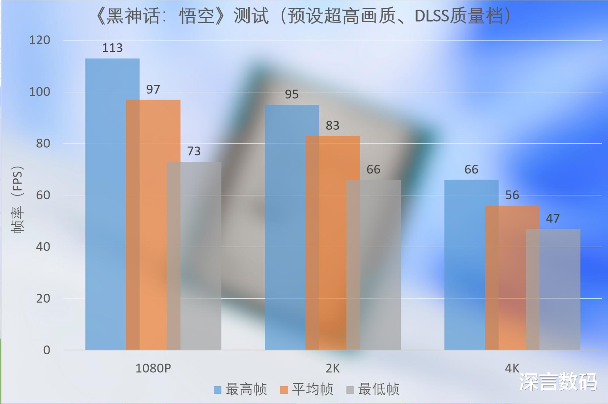 《黑神话:悟空》游戏直接套用预设超高画质方案,并开启DLSS质量档位关闭帧生成与光追效果,分别测试4K、2K与1080P三种分辨率下的帧率,在1080P分辨率下平均帧为97FPS,在2K分辨率下平均帧为83FPS,即便最低帧率也有66FPS,在4K分辨率下没法稳定60FPS。
