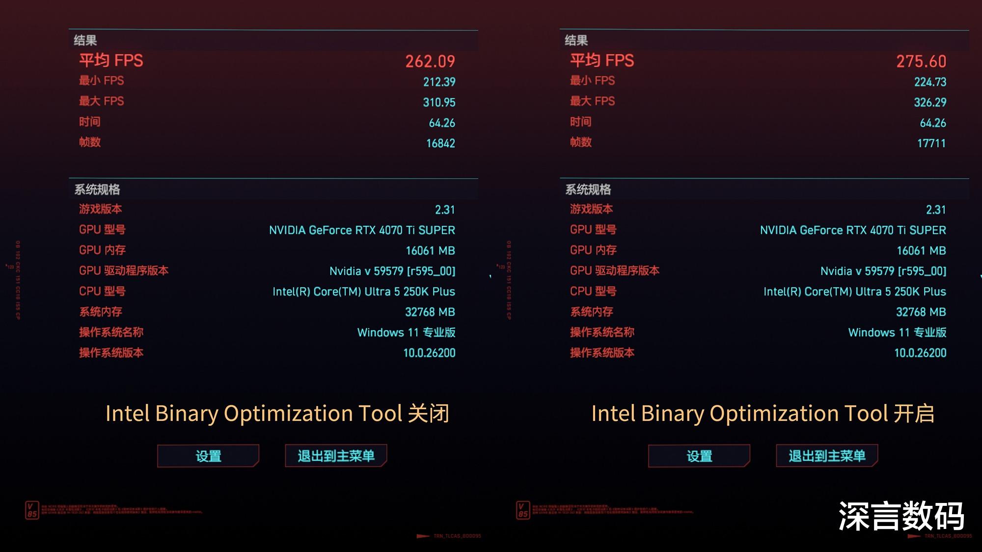 将《赛博朋克2077》游戏画面分辨率设为1080P,预设低画质设定并开启DLSS性能档,游戏内基准性能测试中平均帧率为262.09FPS,当开启英特尔二进制优化技术后游戏平均帧率为275.6FPS,游戏平均帧率增幅也有约5%。