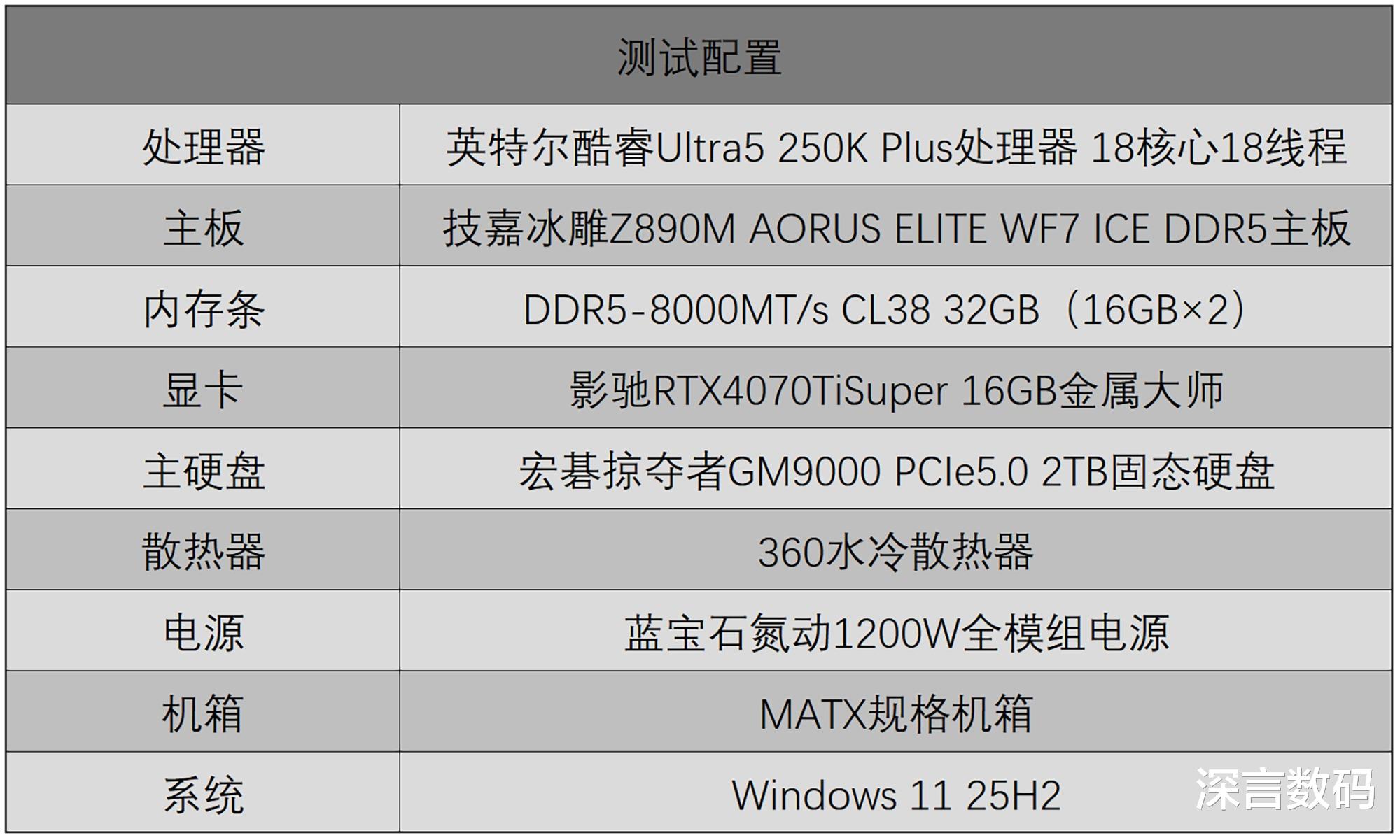 正所谓好马配好鞍,需要搭配合适的硬件才能充分发挥处理器性能,本次详细硬件配置,主板为技嘉Z890M DDR5冰雕,显卡为RTX4070Ti Super 16GB,DDR5 8000MT/s CL38 32GB内存条,硬盘为宏碁掠夺者GM9000 2TB PCIe5.0固态硬盘,操作系统为Windows 11 25H2版本,电源为蓝宝石氮动1200W全模组电源,并搭配360水冷散热器。