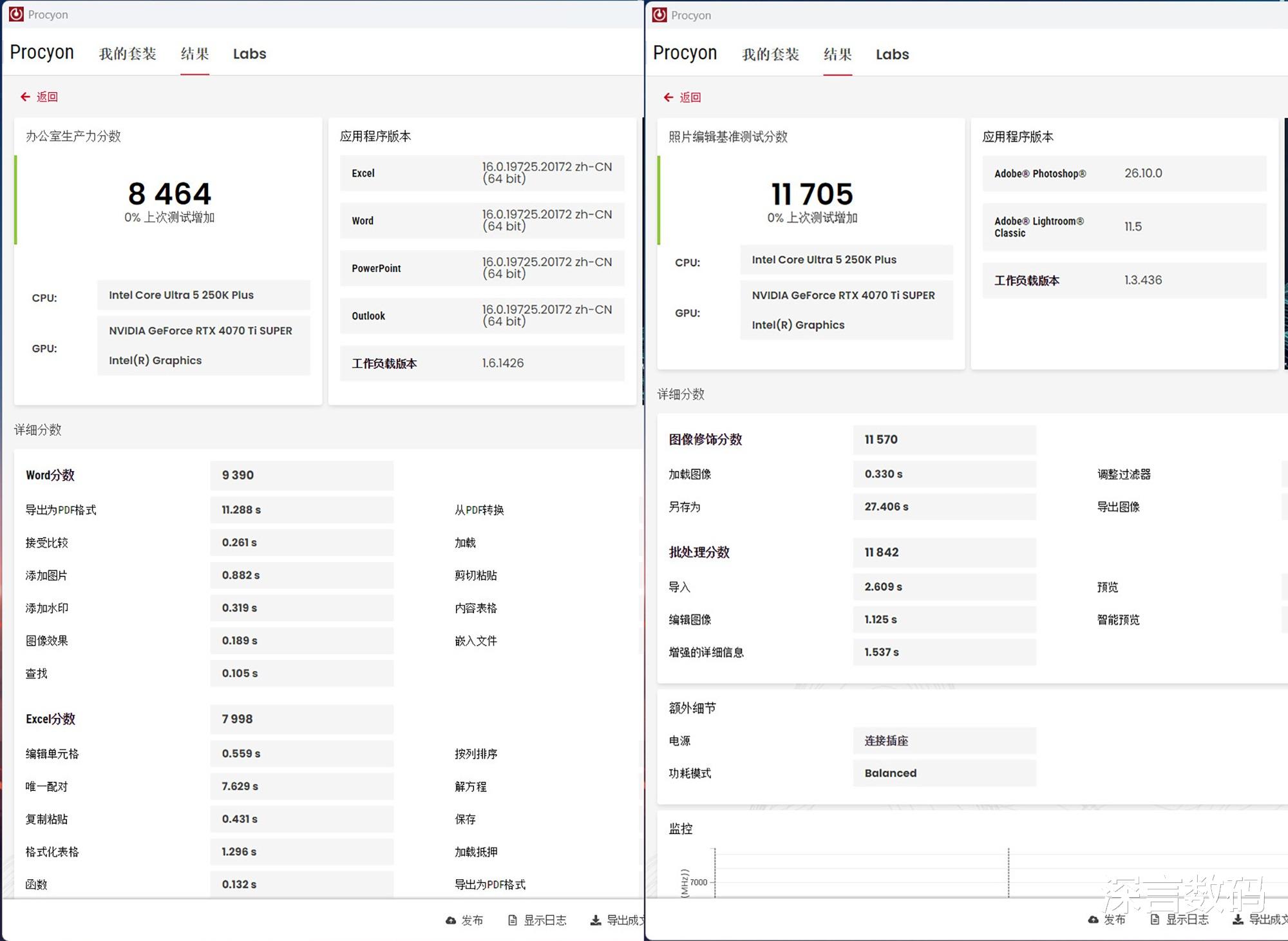 UL Procyon基准性能测试套件,可测量硬件平台在一系列生产力软件中的性能表现,包括Office套件办公、照片视频编辑和AI推理性能测试,实测英特尔酷睿Ultra5 250K Plus处理器在办公室生产力基准测试项目中的得分为8464,照片编辑基准测试项目中的得分为11705。