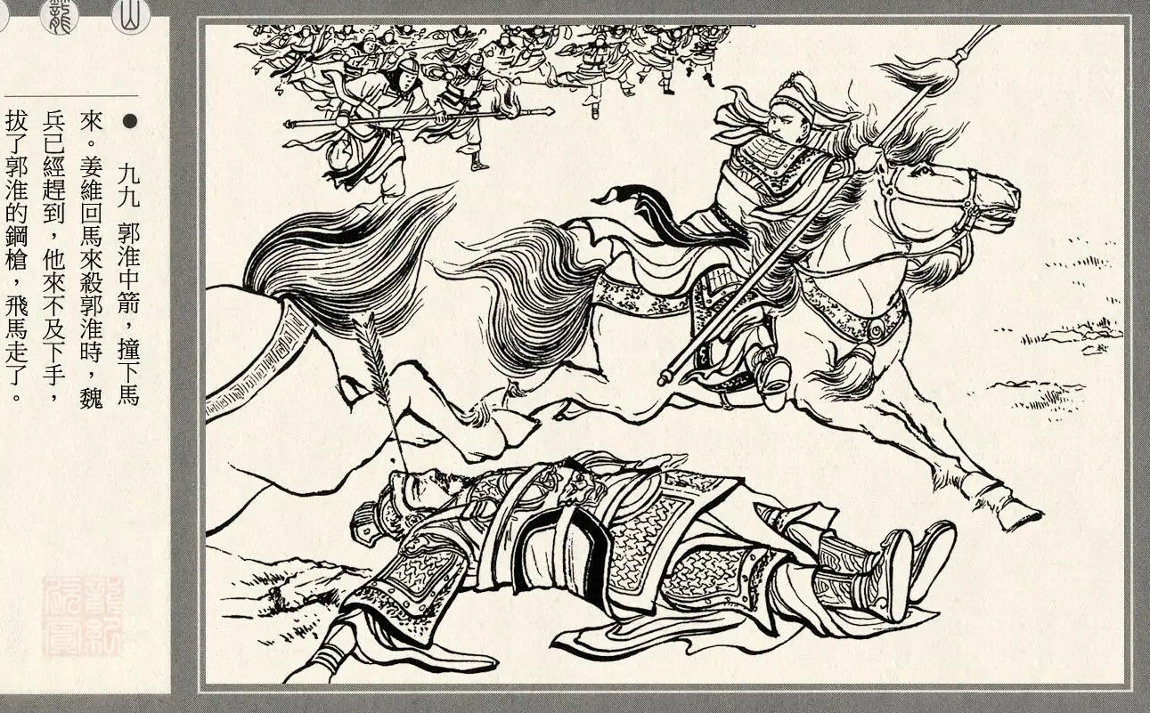 姜维第二次北伐,事态的发展很有戏剧性。一开始节节胜利,姜维先是诱杀了魏国大将许质,接着将司马昭困在铁笼山,眼看大功告成。不料郭淮用诈降计破了羌兵,又利用羌兵混进蜀营,杀了蜀军一个措手不及。姜维逃得很狼狈,兵器都没带,随身只有一副弓箭,路上跑的慌张,箭掉光了都不知道,哪里还有点大将风度。郭淮在后面紧追不舍,姜维虚拽弓弦,郭淮几次躲闪,不见箭到,猜到是姜维无箭,于是他照着姜维射了一箭。这一箭出去反倒帮了姜维,姜维接箭在手,对着郭淮面门就射了出去,郭淮中箭落马,被救回曹营后失血过多而死。