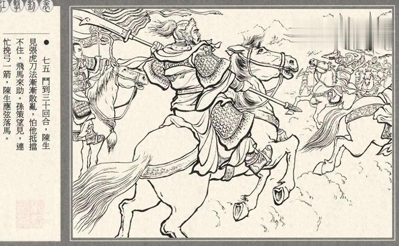 孙坚跨江击刘表,孙策第一次随父出征,表现亮眼。黄祖手下大将张虎与韩当交手二十多个回合后渐渐落了下风,陈生飞马上前,准备两打一。在后方掠阵的孙策抬手就是一箭,正中面门,陈生应声落马而亡。