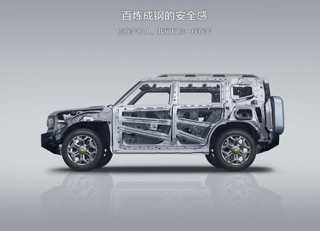 再聊聊那些容易被忽略,但影响实际用车体验的“冷门”配置和数据,这也是这台入门版的亮点。先是车身结构,它用的是承载式车身,虽然不是常规硬派越野的非承载式(带大梁),但高强度钢占比高达80%,车身扭转刚度有32000N·m/deg,简单说就是车身特别结实。