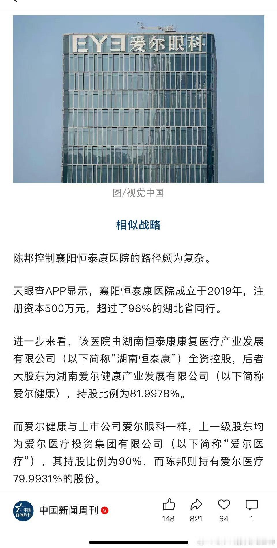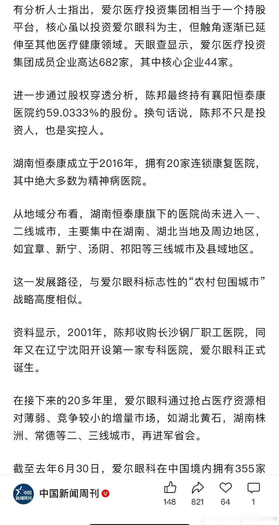 报道摘录:进一步通过股权穿透分析,陈邦最终持有襄阳恒泰康医院约59.0333%的股份。换句话说,陈邦不只是投资人,也是实控人。