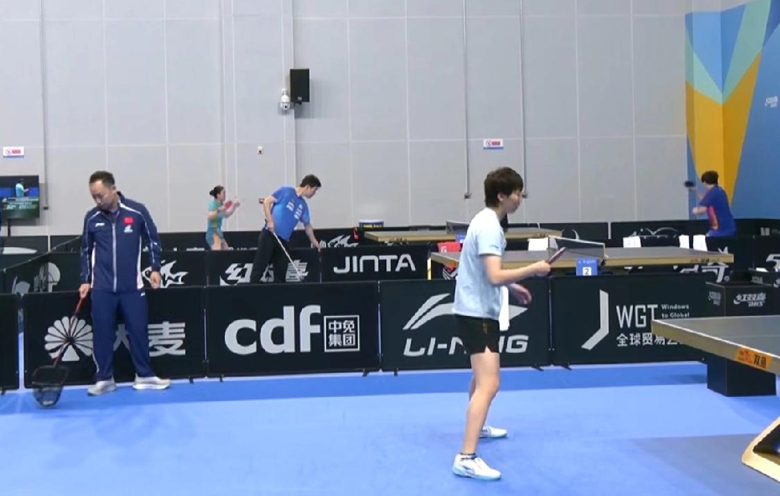 海口亚洲杯最后一个比赛日,女单半决赛前,王曼昱在训练馆进行热身训练。与队友王晓彤对练。 今日半决赛对手日本选手张本美和在旁边的桌子与一名男选手对练。这男选手也是体型膀大腰圆的壮硕。难怪昨天陈幸同打张本美和时,完全被美和的质量压制。看来美和真的一直在优化自己的技战术包括绝对质量。 但是王曼昱也一直在快速进步,相信曼昱的实力,一定可以战胜张本美和! 任浩教练在身边也在时不时为曼昱讲解各种注意事项!