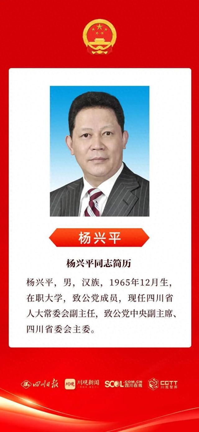 2月7日下午举行的四川省第十四届人民代表大会第五次会议第三次全体会议,选举杨兴平为四川省第十四届人民代表大会常务委员会副主任。