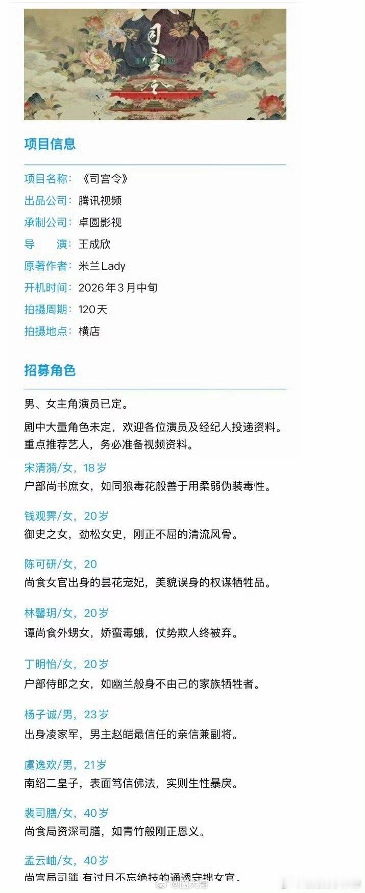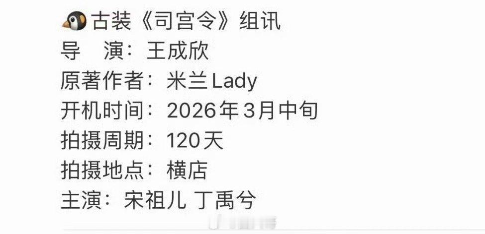 宋祖儿丁禹兮新剧组讯宋祖儿和宋祖儿的新剧组讯来了。《司宫令》将在3月份开机。据说谢可寅也会出演这部剧。拍摄周期120天,导演王成欣。能码到这个阵容,看得出来剧组的诚意了啊!宋祖儿丁禹兮谢可寅司宫令开机