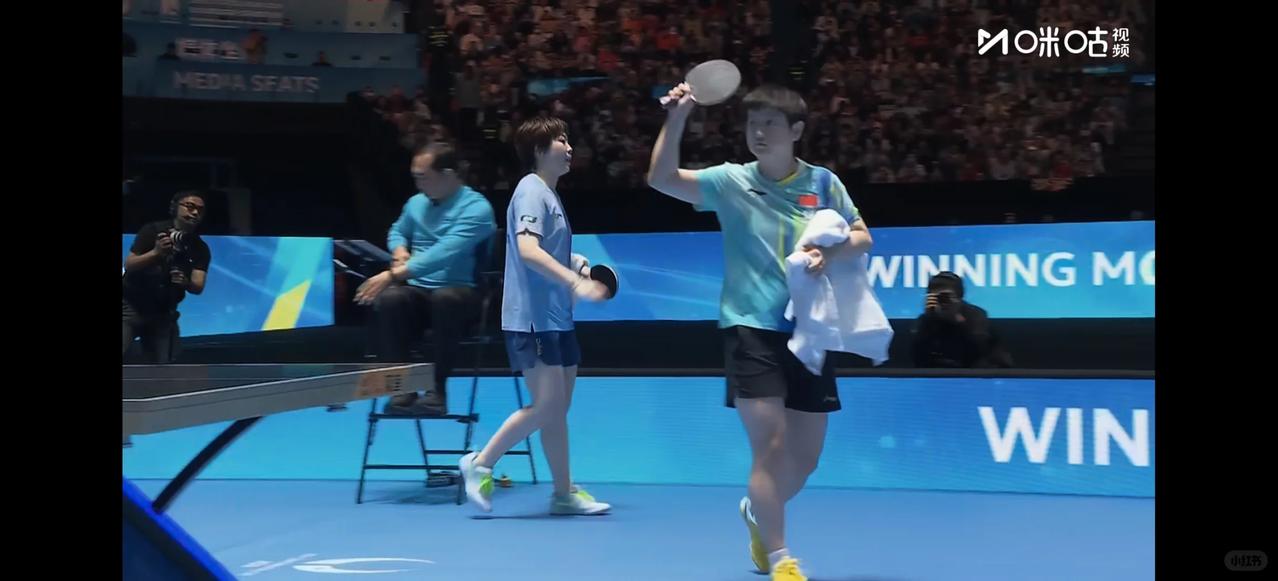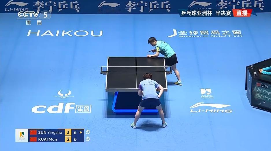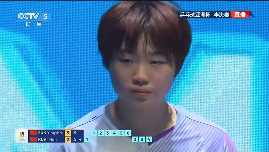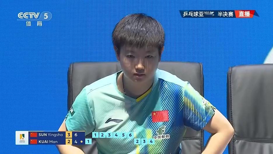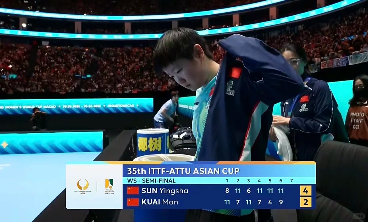 恭喜莎莎晋级亚洲杯女单决赛。 确实是队友之间的比赛不好打啊,大家彼此都很熟悉。不过看得出来,莎莎经过一段时间的调整和休息,这次亚洲杯状态确实好了很多,她也说希望自己能够在比赛中调整到最佳的竞技状态。在刚刚的女单半决赛中,莎莎是4-2战胜了蒯曼,晋级女单决赛,决赛将对阵王曼昱和张本美和直接的胜者。 每次局间休息的时候,导播都会把镜头给到莎莎,莎莎在那坐着的时候,就是在思考了,今天莎莎打球也很坚定,莎莎打球时的力量确实很大。因为海南的天气有些潮湿,莎莎在局间的时候都会给自己的球拍盖个小毛巾,昨天就有记者问莎莎了,莎莎说这是“秘诀”。莎莎局间休息在喝水的时候,这个吉祥物也在旁边喝水,还看莎莎,好生动啊,这次亚洲杯这个大屏挺好的。 因为是队友之间的比赛,所以是没有场外的,比赛结束后,看到戴眼镜的队医姐姐过来把衣服给了莎莎,今天应该是出汗多了,莎莎打完比赛就穿上外套了,因为只有一个球台打比赛,所以莎莎可以穿好衣服再走,辛苦了,回去好好休息,晚上还有决赛。