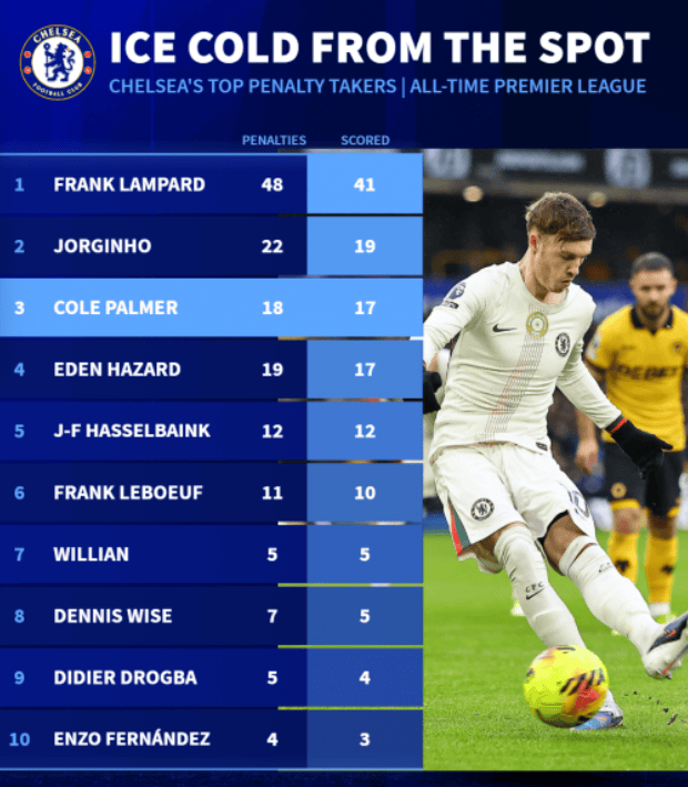 虎扑02月08日讯在刚刚结束的切尔西3-1击败狼队的比赛中,帕尔默完成了帽子戏法,其中包括两粒点球。这使他的英超点球进球数达到17个,追平了阿扎尔,在队史英超点球得分榜上排名第三,距离第二名的若日尼奥仅差两球,不过追上第一名的兰帕德有相当大的难度。