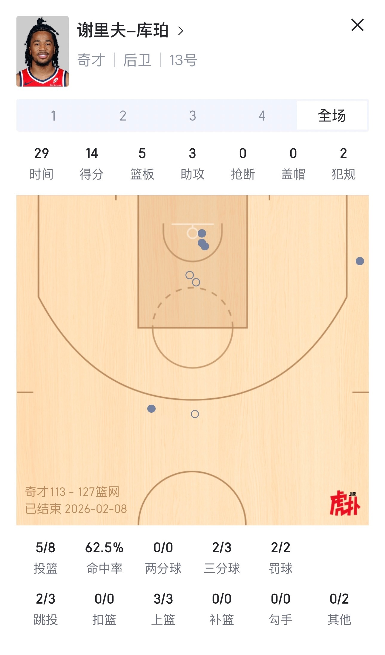 谢里夫库珀连场上双。上一场18分之后,本场得到14分5篮板3助攻。辽宁男篮