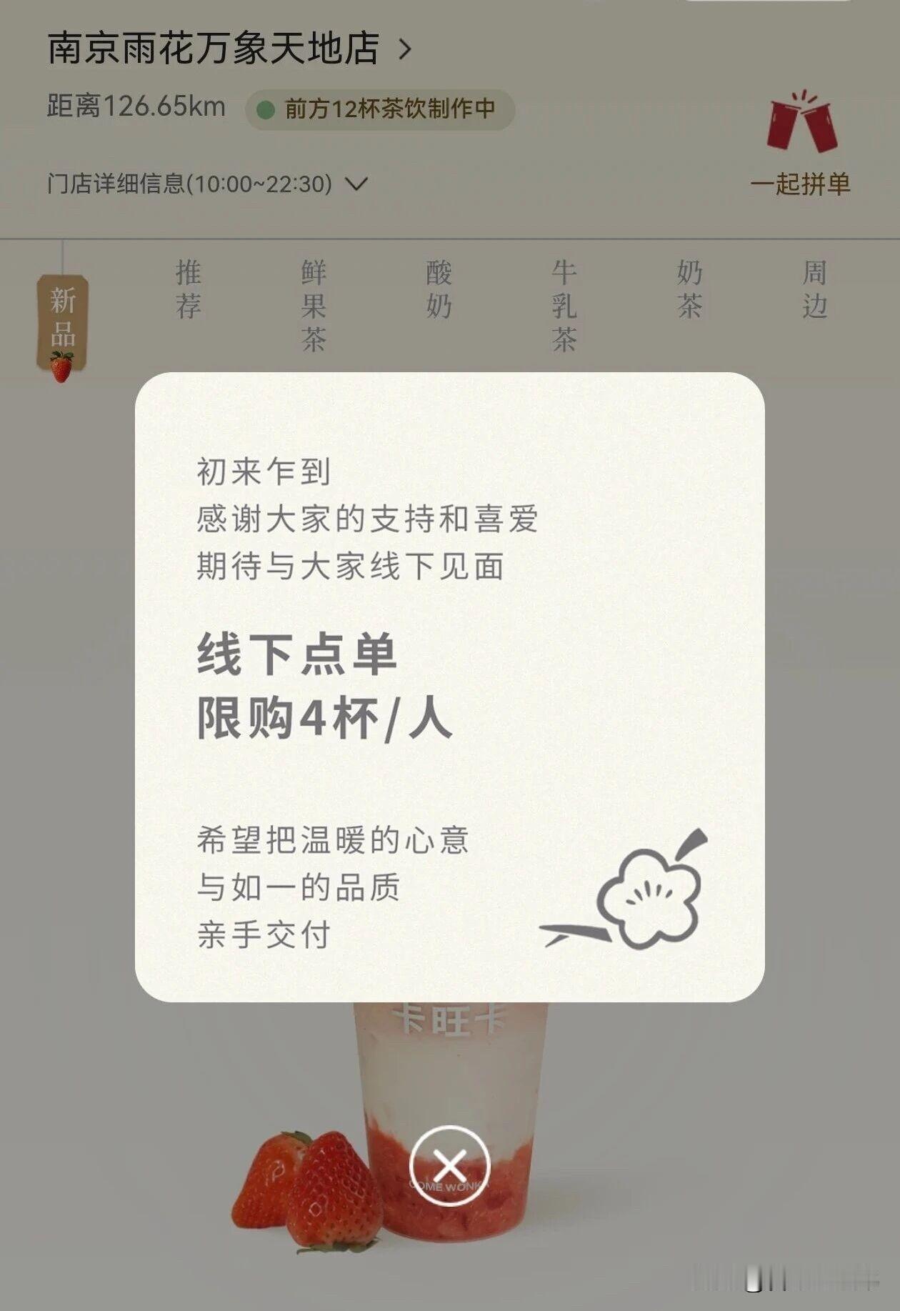 2月8日上午,卡旺卡南京雨花万象天地店正式开业,这也是合肥本土茶饮品牌目前省外唯一营业门店。 开业人气太旺,门店直接实行首日限购:仅支持线下点单,每人限购4杯。 合肥人的快乐,南京朋友也能喝到了~