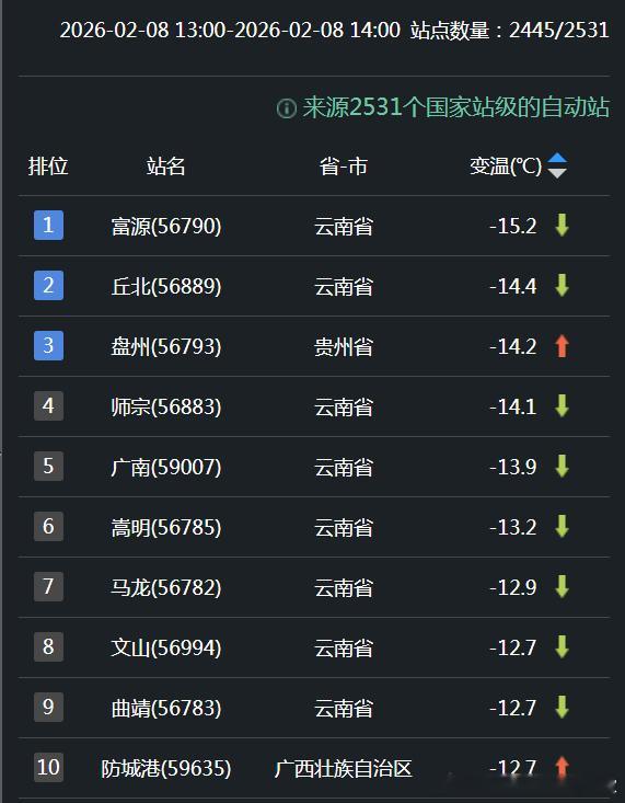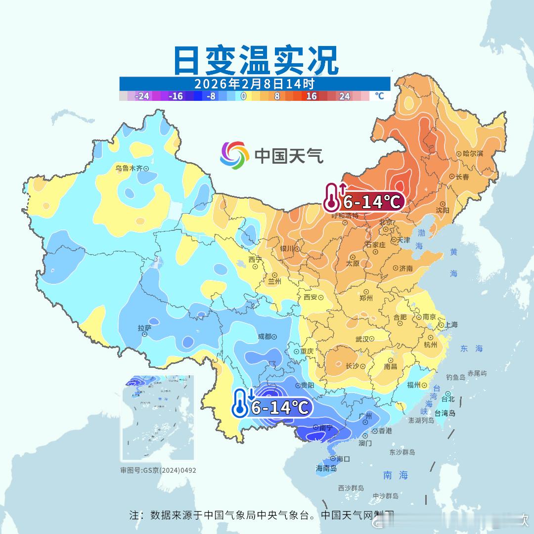 【气温波动】今天下午对比昨天下午,升温和降温,都明显。因为寒潮南下,云南东部、贵州西部、广西南部,降温6-14℃。云南富源降15.2℃,贵州盘州降14.2℃,广西防城港降12.7℃,为各自省区14时降温最强站点。在寒潮影响结束后,内蒙古多地升温6-14℃,包揽了14时升温榜前十,镶黄旗升15.2℃,巴林右旗升15.1℃,化德升14.9℃,正镶白旗升14.9℃,林西升14.8℃,排名前五。。