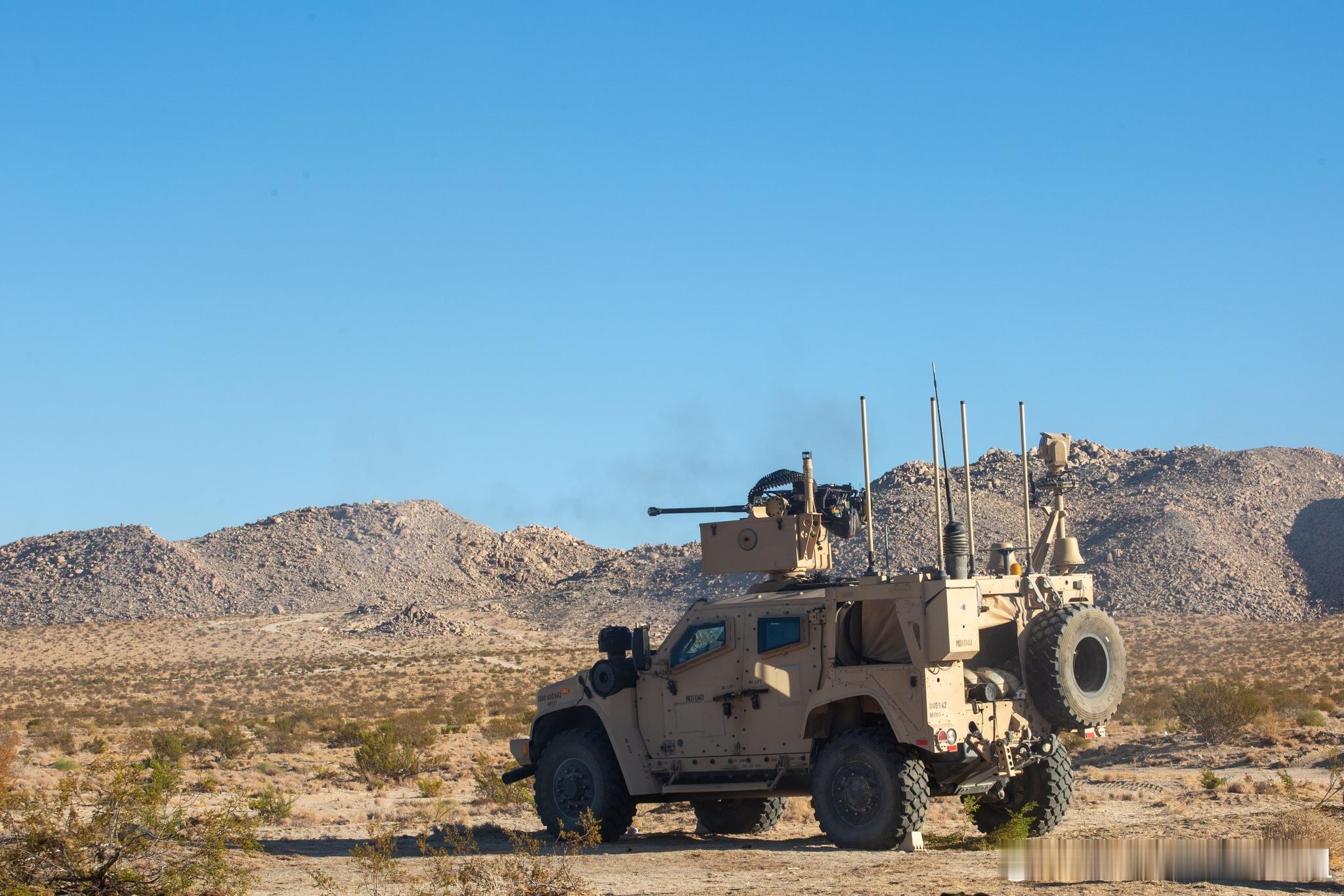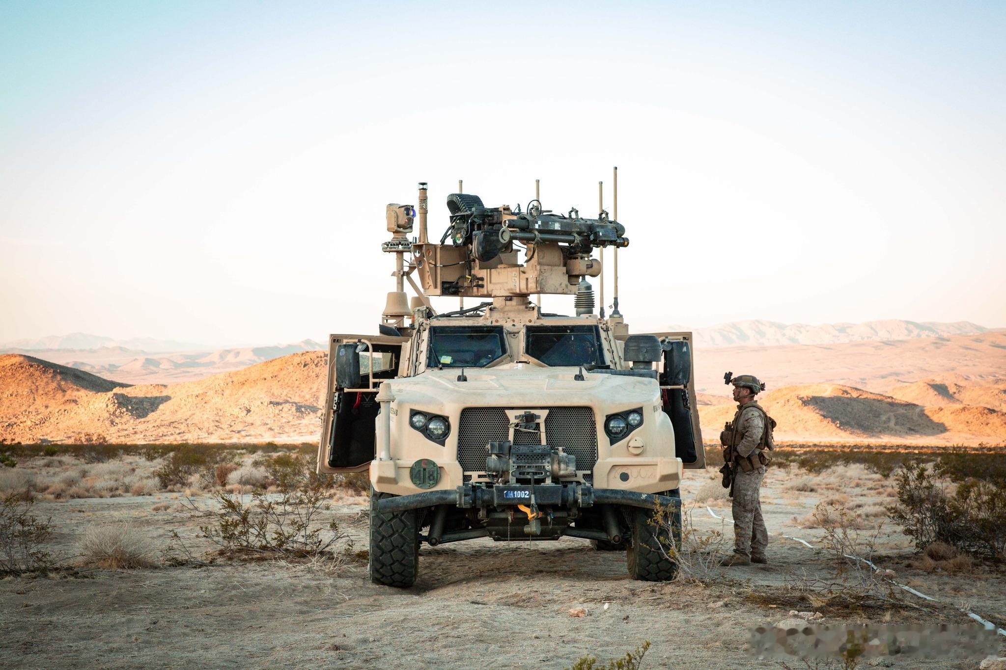 【作训】美海军陆战队濒海防空营支援美国陆军完成在国家训练中心的轮训△在去年的9月,第25-11轮训中,来自第2步兵师的第2斯特赖克旅级战斗队得到了来自第3陆战濒海防空营的地面防空炮兵连的支持,以保护该旅不受有人和无人的空中威胁。△地面防空炮兵连使用了海军陆战队综合防空系统MADIS,该系统是陆战队的伴随防空系统,以双车为基本作战单元,使用联合轻型战术车(JLTV),Mk1作为武备车,主要负责对抗固定翼飞机和直升机等传统空中目标,也可对无人机进行硬杀伤。主要武器为一座集成了XM914E1型30毫米机炮、一挺同轴7.62毫米机枪,并预留“毒刺”防空导弹发射接口的遥控武器站。Mk2为指控车,主要负责态势感知和反无人机,整合光学和雷达两种探测方式,搭载了电子战套件和指控系统。△同时因为美国陆军和陆战队共同推进了联合作战指挥平台(JBC-P)项目,两个军种可以无缝对接。