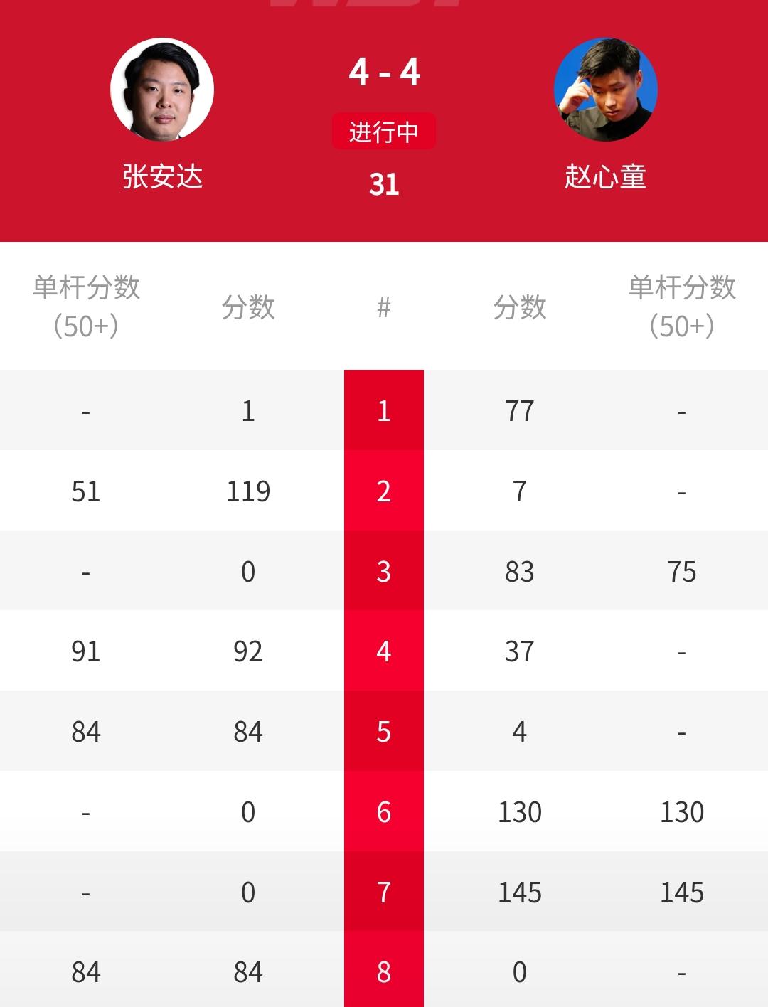 轰145-0、130-0,赵心童4-4战平张安达,世界大奖赛决赛第一阶段势均力敌!北京时间2月8日消息,2026斯诺克世界大奖赛展开冠军争夺战。刚刚结束的决赛第一阶段,两位中国选手赵心童与张安达势均力敌,双方以4-4战成平局。接下来的第二阶段,从19:00开始,在19局10胜的赛制中,谁能再赢五局,就将夺得冠军。此前的半决赛,赵心童以6-2战胜肖国栋,张安达以6-5险胜周跃龙。斯诺克世界大奖赛 赵心童