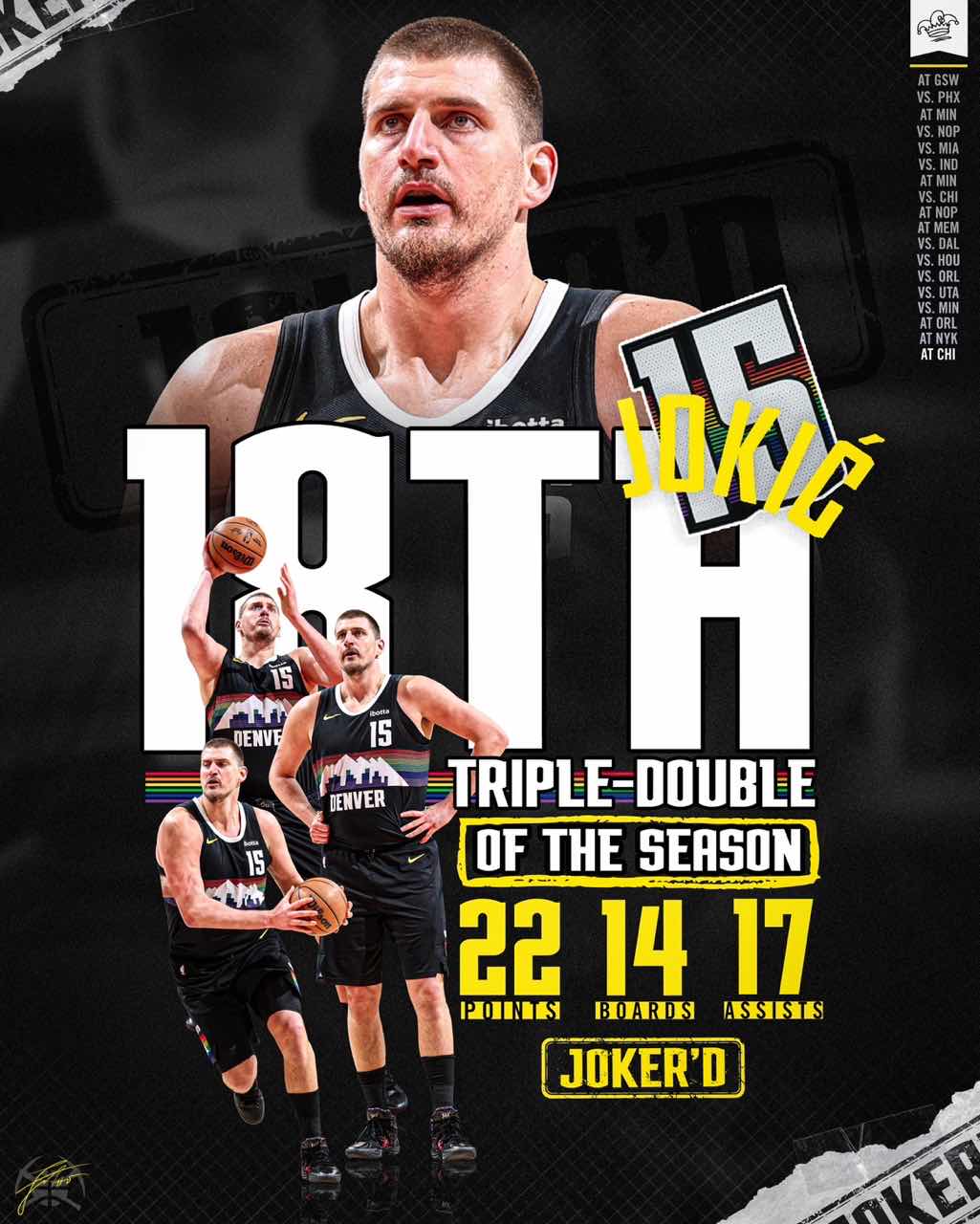 赛后,掘金社媒分享本场比赛约基奇数据海报:今晚的《Joker'd》节目打破了收视纪录。