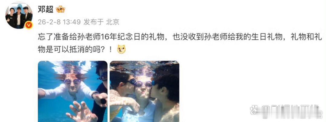8日,是邓超47岁生日,也是他与孙俪结婚16周年纪念日。邓超发文表示忘了准备给孙俪16年纪念日的礼物,也没收到孙俪给他的生日礼物,“礼物和礼物是可以抵消的吗?!”配图是一家四口的水下照,等等、小花亲吻了孙俪脸颊!
